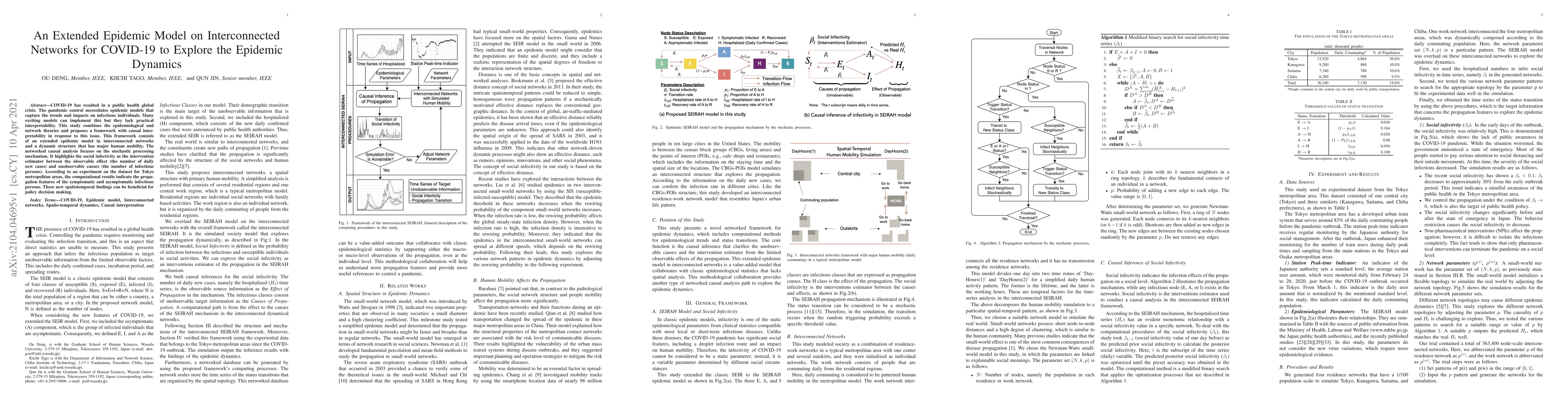 COVID-19 has resulted in a public health global crisis. The pandemic control necessitates epidemic models that capture the trends and impacts on infectious individuals. Many exciting models can implement this but they lack practical interpretability. This study combines the epidemiological and network theories and proposes a framework with causal interpretability in response to this issue. This framework consists of an extended epidemic model in interconnected networks and a dynamic structure that has major human mobility. The networked causal analysis focuses on the stochastic processing mechanism. It highlights the social infectivity as the intervention estimator between the observable effect (the number of daily new cases) and unobservable causes (the number of infectious persons). According to an experiment on the dataset for Tokyo metropolitan areas, the computational results indicate the propagation features of the symptomatic and asymptomatic infectious persons. These new spatiotemporal findings can be beneficial for policy decision making.