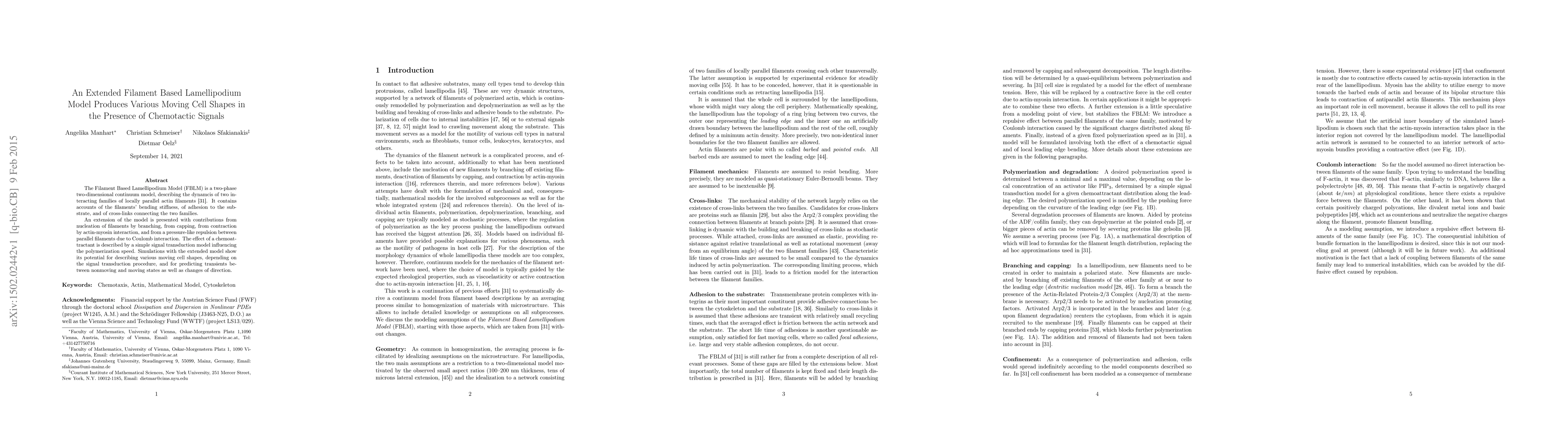 The Filament Based Lamellipodium Model (FBLM) is a two-phase two-dimensional continuum model, describing the dynamcis of two interacting families of locally parallel actin filaments (C.Schmeiser and D.Oelz, How do cells move? Mathematical modeling of cytoskeleton dynamics and cell migration. Cell mechanics: from single scale-based models to multiscale modeling. Chapman and Hall, 2010). It contains accounts of the filaments' bending stiffness, of adhesion to the substrate, and of cross-links connecting the two families. An extension of the model is presented with contributions from nucleation of filaments by branching, from capping, from contraction by actin-myosin interaction, and from a pressure-like repulsion between parallel filaments due to Coulomb interaction. The effect of a chemoattractant is described by a simple signal transduction model influencing the polymerization speed. Simulations with the extended model show its potential for describing various moving cell shapes, depending on the signal transduction procedure, and for predicting transients between nonmoving and moving states as well as changes of direction.