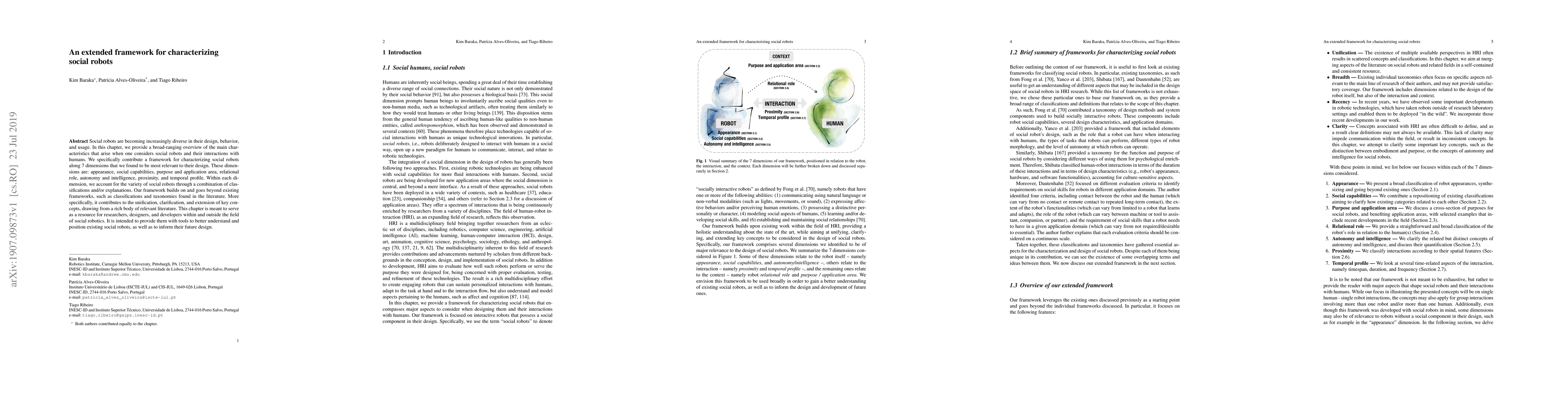 This paper presents a comprehensive framework for characterizing social robots across seven dimensions: appearance, social capabilities, purpose, relational role, autonomy, proximity, and temporal profile. It aims to unify and extend existing classifications, offering researchers and developers tools to better understand and design social robots.