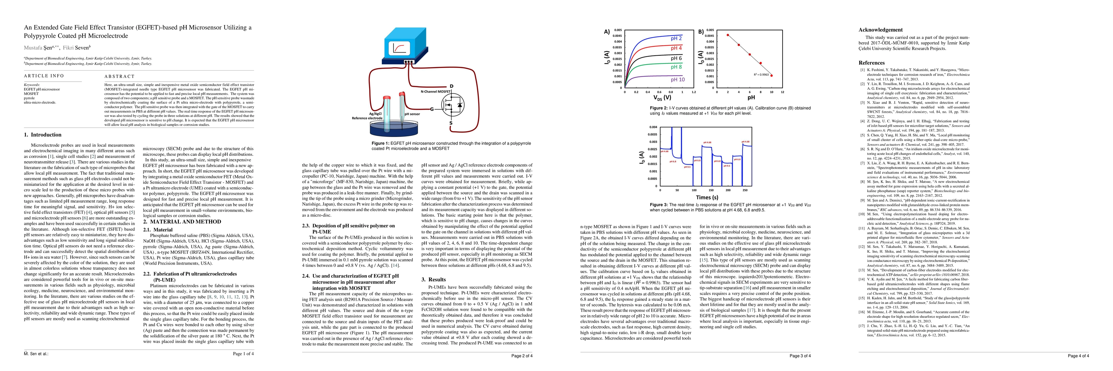 Here, an ultra-small size, simple and inexpensive metal oxide semiconductor field effect transistor (MOSFET)-integrated needle type EGFET pH microsensor was fabricated. The EGFET pH microsensor has the potential to be applied to fast and precise local pH measurements. The system was composed of two components; a pH sensitive probe and a MOSFET. The pH sensitive probe was made by electrochemically coating the surface of a Pt ultra micro-electrode with polypyrrole, a semiconductor polymer. The pH sensitive probe was then integrated with the gate of the MOSFET to carry out measurements in PBS at different pH values. The real time response of the EGFET pH microsensor was also tested by cycling the probe in three solutions at different pH. The results showed that the developed pH microsensor is sensitive to pH change. It is expected that the EGFET pH microsensor will allow local pH analysis in biological samples or corrosion studies.