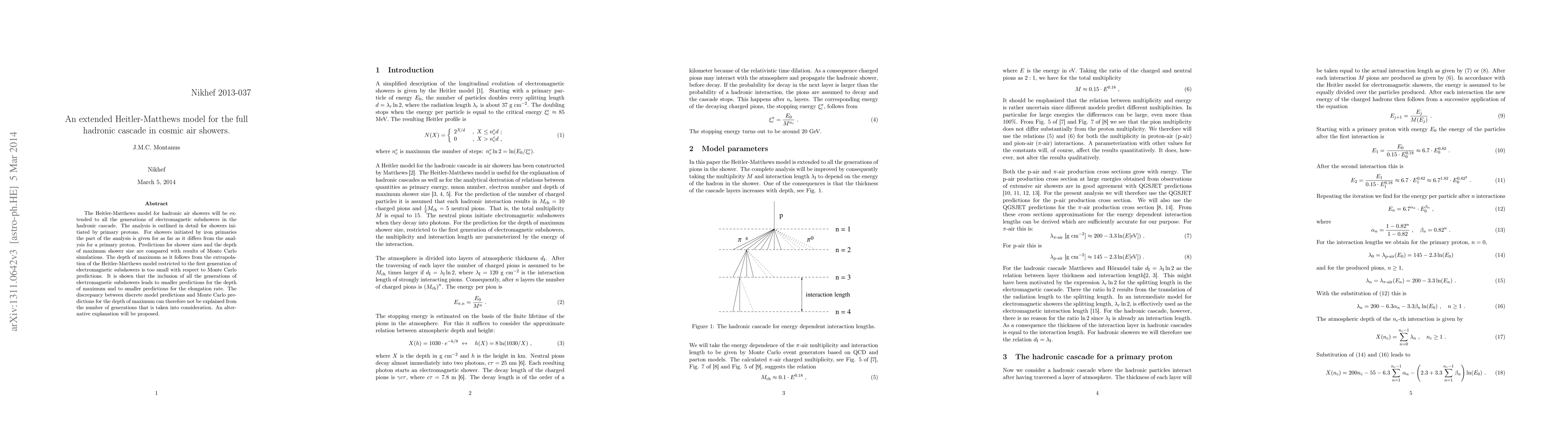 The Heitler-Matthews model for hadronic air showers will be extended to all the generations of electromagnetic subshowers in the hadronic cascade. The analysis is outlined in detail for showers initiated by primary protons. For showers initiated by iron primaries the part of the analysis is given for as far as it differs from the analysis for a primary proton. Predictions for shower sizes and the depth of maximum shower size are compared with results of Monte Carlo simulations. The depth of maximum as it follows from the extrapolation of the Heitler-Matthews model restricted to the first generation of electromagnetic subshowers is too small with respect to Monte Carlo predictions. It is shown that the inclusion of all the generations of electromagnetic subshowers leads to smaller predictions for the depth of maximum and to smaller predictions for the elongation rate. The discrepancy between discrete model predictions and Monte Carlo predictions for the depth of maximum can therefore not be explained from the number of generations that is taken into consideration. An alternative explanation will be proposed.