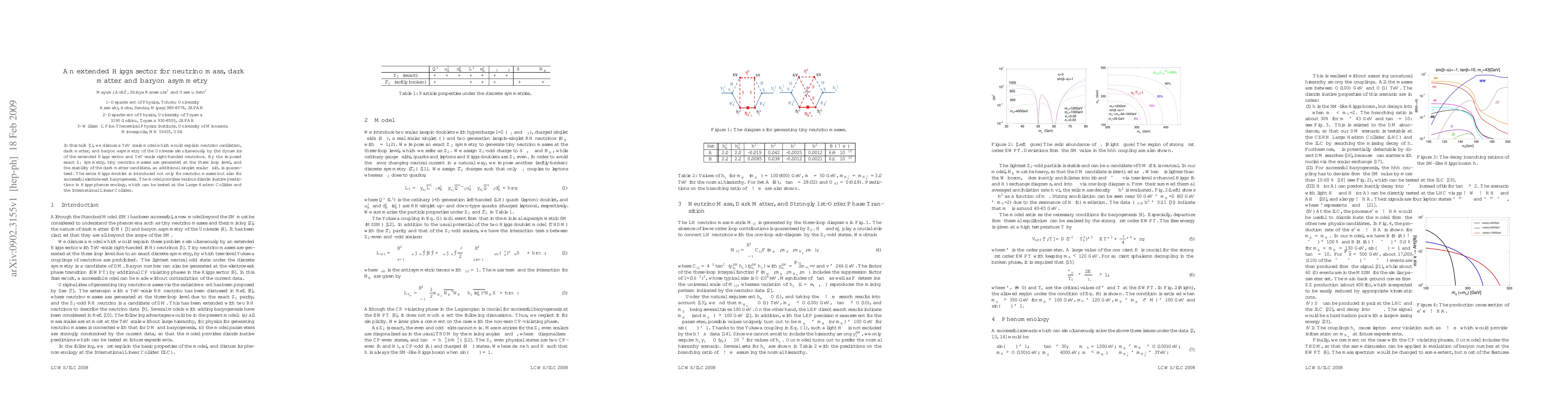 In this talk, we discuss a TeV scale model which would explain neutrino oscillation, dark matter, and baryon asymmetry of the Universe simultaneously by the dynamics of the extended Higgs sector and TeV-scale right-handed neutrinos. By the imposed exact $Z_2$ symmetry, tiny neutrino masses are generated at the three loop level, and the stability of the dark matter candidate, an additional singlet scalar field, is guaranteed. The extra Higgs doublet is introduced not only for neutrino masses but also for successful electroweak baryogenesis. The model provides various discriminative predictions in Higgs phenomenology, which can be tested at the Large Hadron Collider and the International Linear Collider.