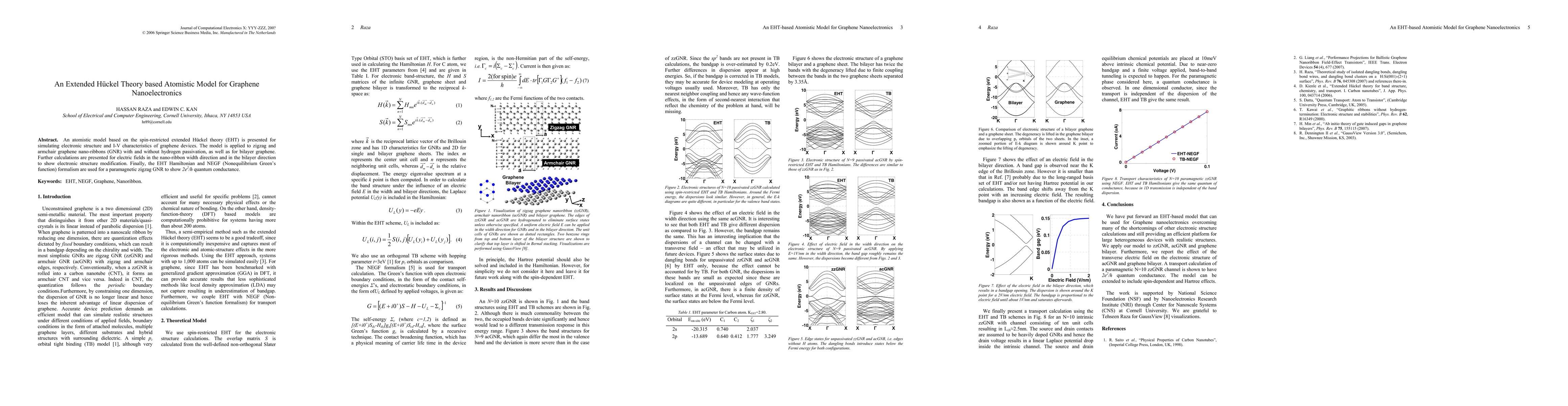 An atomistic model based on the spin-restricted extended Huckel theory (EHT) is presented for simulating electronic structure and I-V characteristics of graphene devices. The model is applied to zigzag and armchair graphene nano-ribbons (GNR) with and without hydrogen passivation, as well as for bilayer graphene. Further calculations are presented for electric fields in the nano-ribbon width direction and in the bilayer direction to show electronic structure modification. Finally, the EHT Hamiltonian and NEGF (Nonequilibrium Green's function) formalism are used for a paramagnetic zigzag GNR to show 2e2/h quantum conductance.