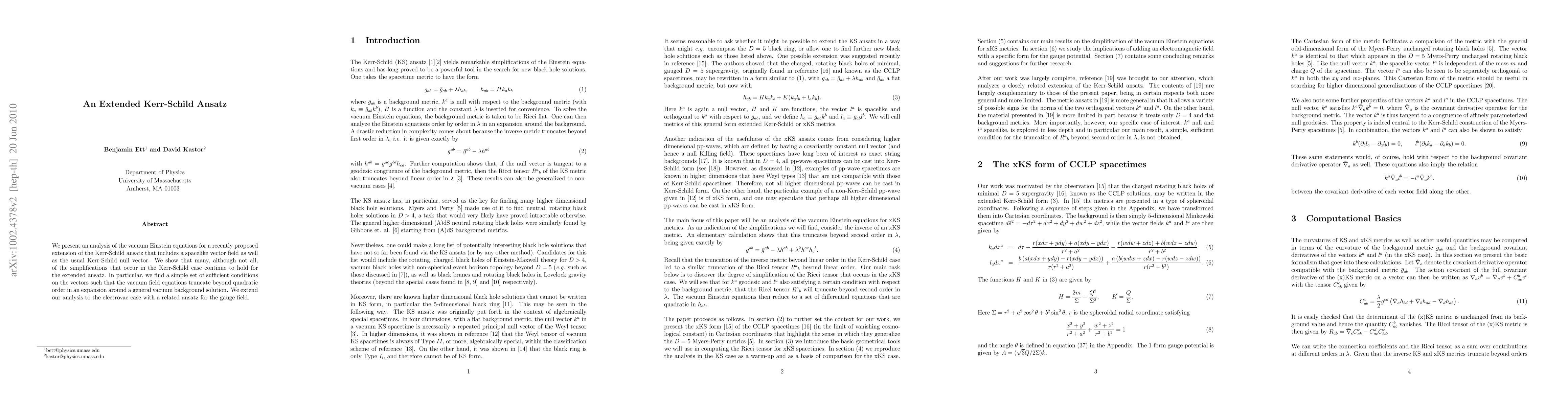 This paper analyzes the vacuum Einstein equations using an extended Kerr-Schild ansatz that incorporates a spacelike vector field alongside the traditional null vector. It demonstrates that many simplifications from the original Kerr-Schild ansatz persist, providing sufficient conditions for truncating the equations beyond quadratic order. The study also extends the analysis to the electrovac case with a related gauge field ansatz.