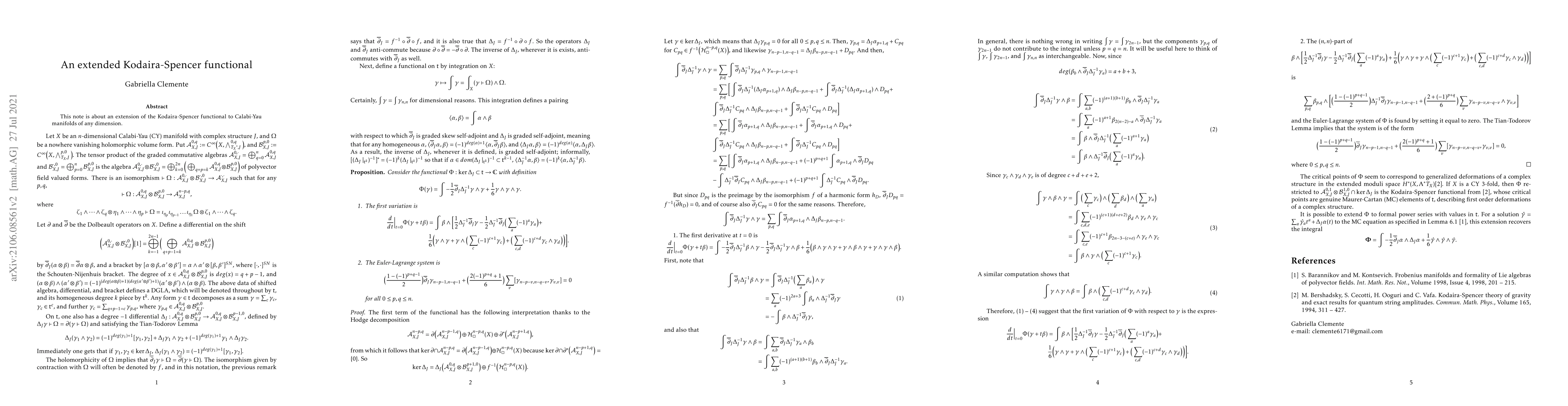 Summary: This paper extends the Kodaira-Spencer functional, originally defined for Kähler manifolds, to Calabi-Yau manifolds of any dimension, providing a broader framework for studying deformations in complex geometry.