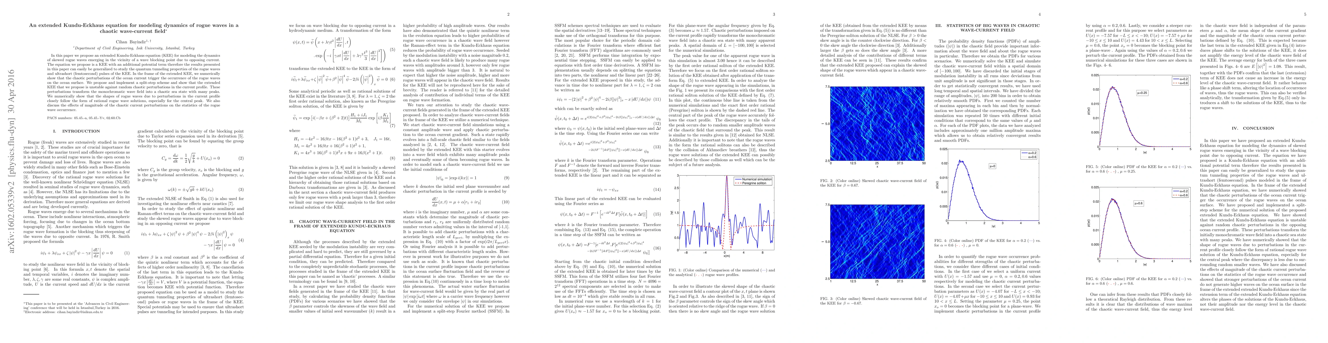 In this paper we propose an extended Kundu-Eckhaus equation (KEE) for modeling the dynamics of skewed rogue waves emerging in the vicinity of a wave blocking point due to opposing current. The equation we propose is a KEE with an additional potential term therefore the results presented in this paper can easily be generalized to study the quantum tunneling properties of the rogue waves and ultrashort (femtosecond) pulses of the KEE. In the frame of the extended KEE, we numerically show that the chaotic perturbations of the ocean current trigger the occurrence of the rogue waves on the ocean surface. We propose and implement a split-step scheme and show that the extended KEE that we propose is unstable against random chaotic perturbations in the current profile. These perturbations transform the monochromatic wave field into a chaotic sea state with many peaks. We numerically show that the shapes of rogue waves due to perturbations in the current profile closely follow the form of rational rogue wave solutions, especially for the central peak. We also discuss the effects of magnitude of the chaotic current perturbations on the statistics of the rogue wave occurrence.