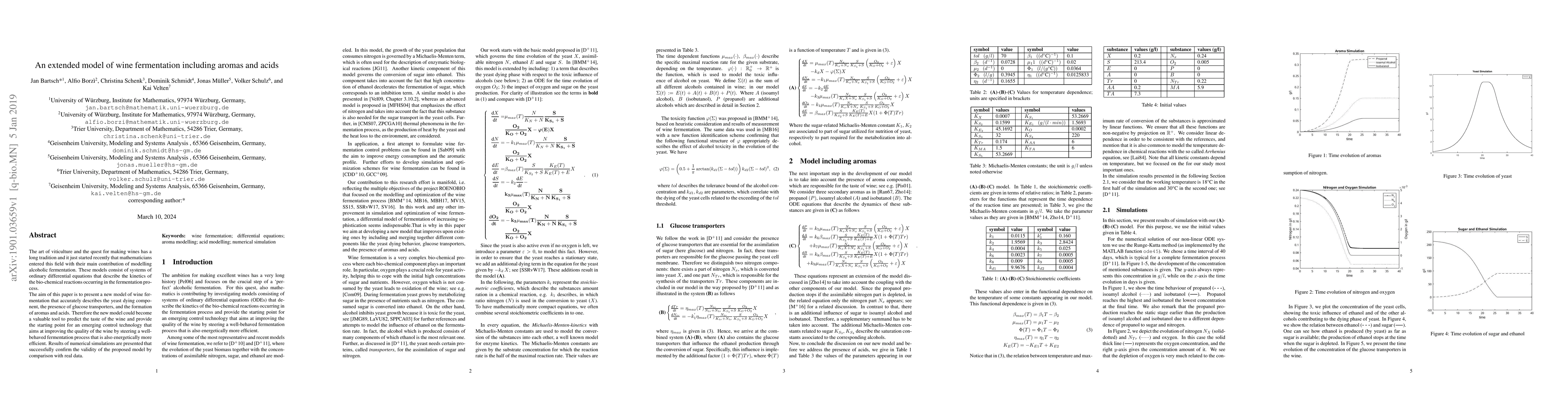 This paper introduces an extended mathematical model for wine fermentation, incorporating yeast dying, glucose transporters, and the formation of aromas and acids. The model aims to predict wine taste and improve fermentation efficiency, validated by numerical simulations compared to real data.