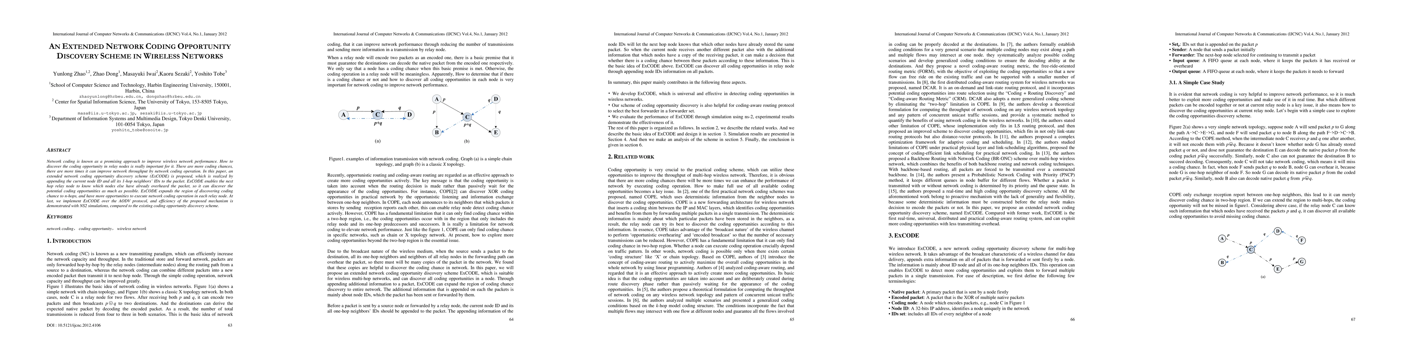 Network coding is known as a promising approach to improve wireless network performance. How to discover the coding opportunity in relay nodes is really important for it. There are more coding chances, there are more times it can improve network throughput by network coding operation. In this paper, an extended network coding opportunity discovery scheme (ExCODE) is proposed, which is realized by appending the current node ID and all its 1-hop neighbors' IDs to the packet. ExCODE enables the next hop relay node to know which nodes else have already overheard the packet, so it can discover the potential coding opportunities as much as possible. ExCODE expands the region of discovering coding chance to n-hops, and have more opportunities to execute network coding operation in each relay node. At last, we implement ExCODE over the AODV protocol, and efficiency of the proposed mechanism is demonstrated with NS2 simulations, compared to the existing coding opportunity discovery scheme.