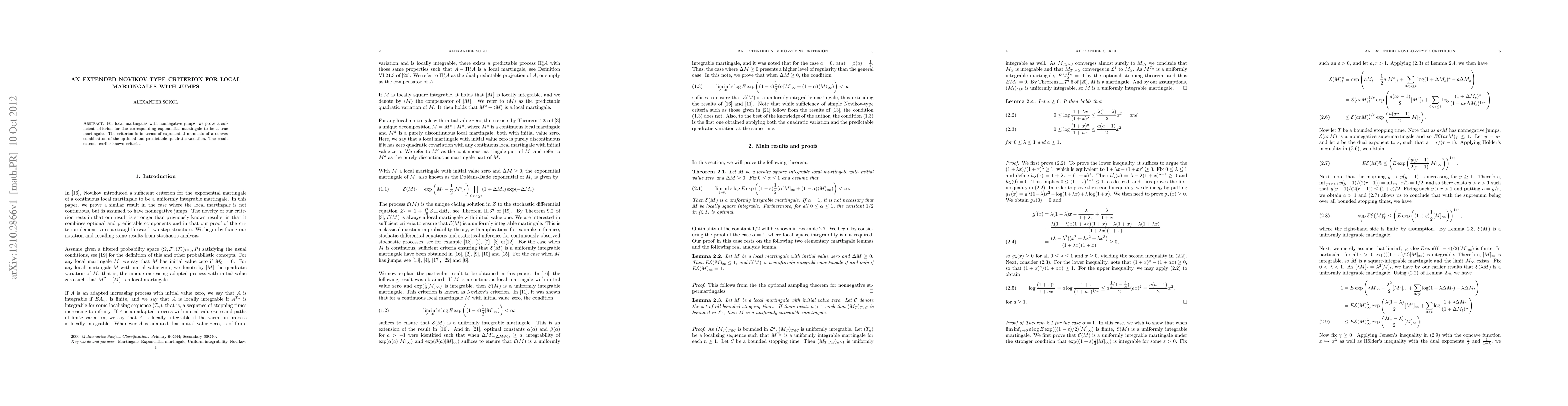 The paper introduces an extended Novikov-type criterion for local martingales with jumps, providing a novel approach to determine when the corresponding exponential martingale is a true martingale.