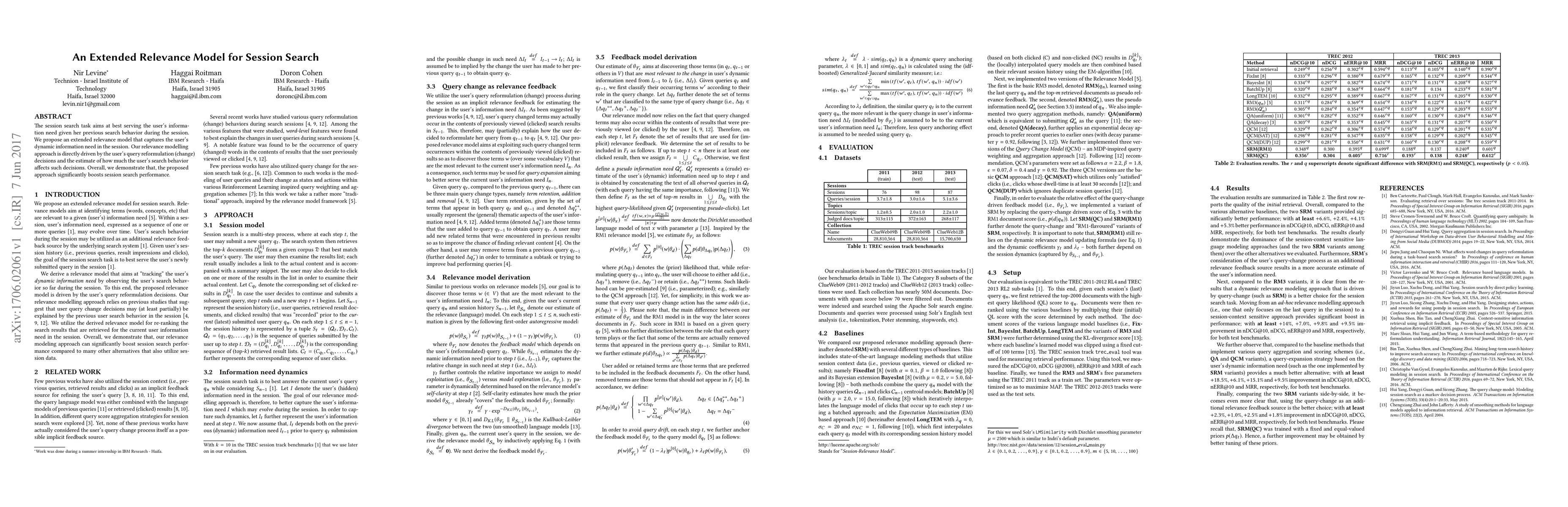 This paper proposes an extended relevance model to improve session search performance by capturing user dynamic information needs through query reformulation decisions. It demonstrates significant boosts in session search performance.