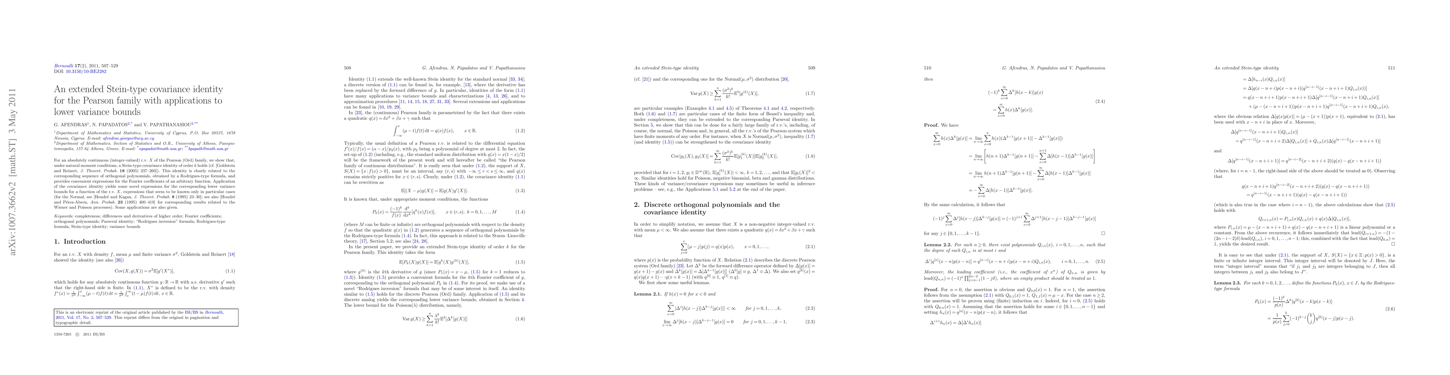 This paper establishes a Stein-type covariance identity for Pearson family variables, linking it to orthogonal polynomials and Fourier coefficients. The identity is used to derive novel lower variance bounds for functions of these variables, extending known results beyond the Normal case.