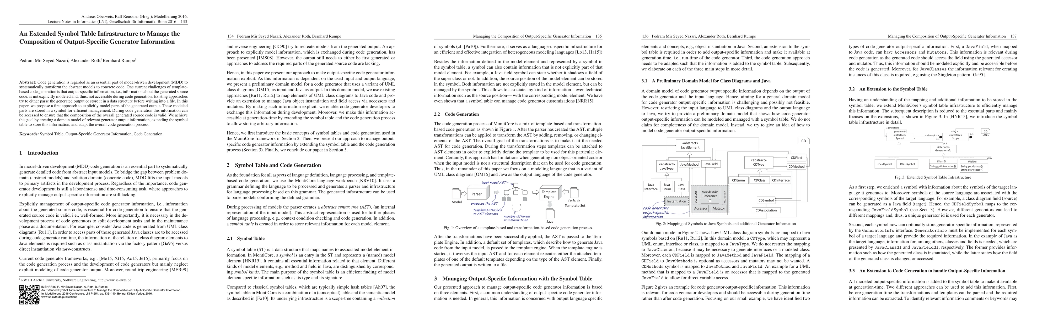 This paper proposes an extended symbol table infrastructure to explicitly model and manage output-specific generator information during code generation in model-driven development. By incorporating this information into a domain model and extending the symbol table, the approach ensures the validity of the generated source code composition.