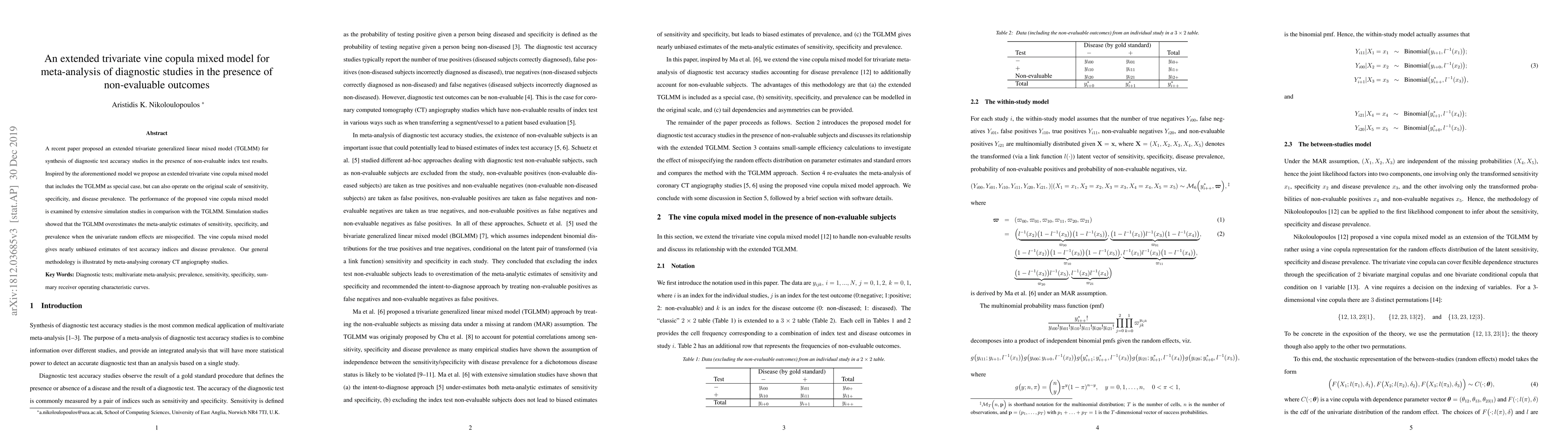 This paper proposes an extended trivariate vine copula mixed model for meta-analysis of diagnostic studies, which can handle non-evaluable outcomes and operates on the original scale of sensitivity, specificity, and prevalence. Simulation studies show that the proposed model provides nearly unbiased estimates compared to the traditional trivariate generalized linear mixed model.