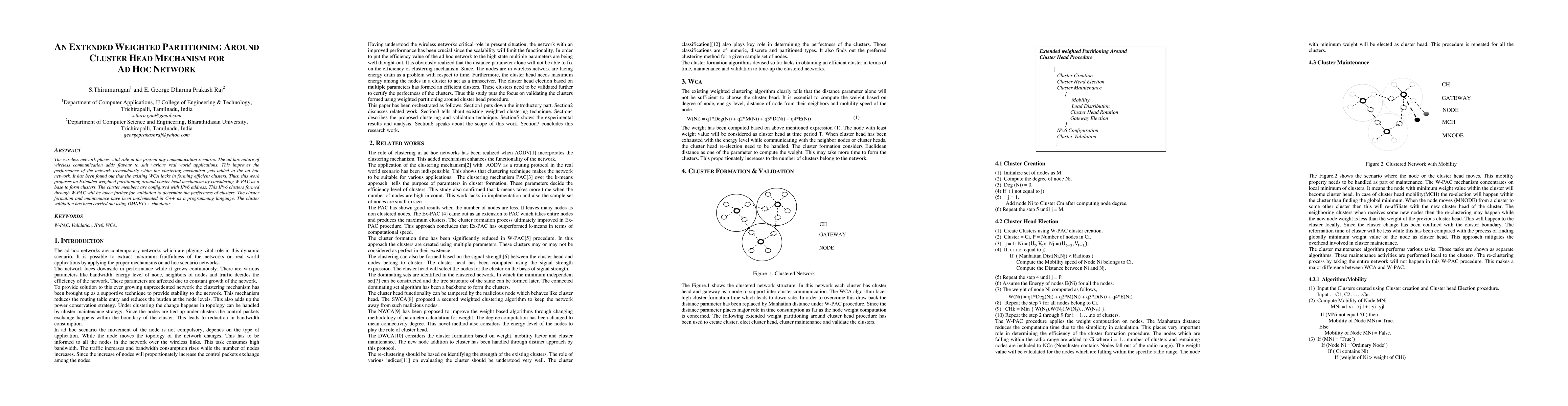 This paper proposes an Extended Weighted Partitioning Around Cluster Head (W-PAC) mechanism to improve cluster formation in ad hoc networks, addressing the inefficiencies of existing methods. The clusters are configured with IPv6 addresses and validated using OMNET++ simulator to ensure optimal cluster performance.