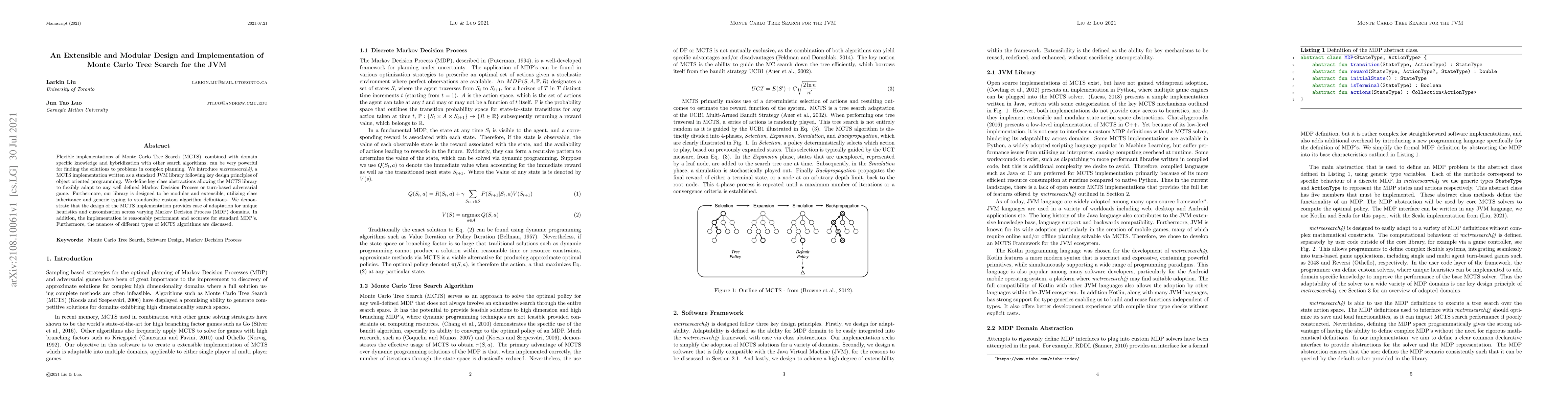 A new Java library called mctreesearch4j is introduced for flexible and modular implementation of Monte Carlo Tree Search (MCTS) algorithm, enabling efficient adaptation to various Markov Decision Process domains.