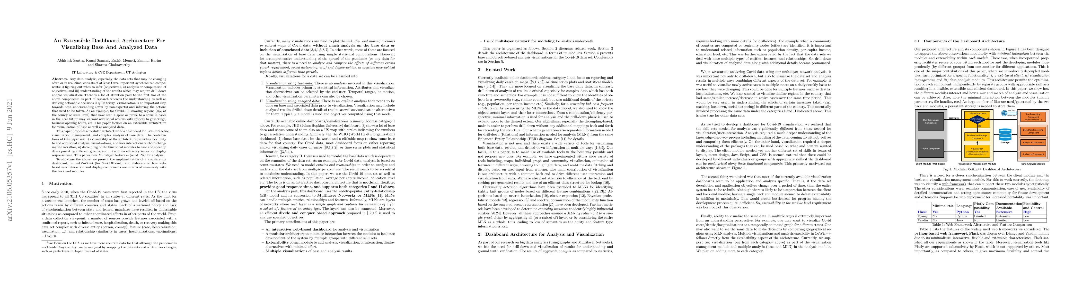 Any data analysis, especially the data sets that may be changing often or in real-time, consists of at least three important synchronized components: i) figuring out what to infer (objectives), ii) analysis or computation of objectives, and iii) understanding of the results which may require drill-down and/or visualization. There is a lot of attention paid to the first two of the above components as part of research whereas the understanding as well as deriving actionable decisions is quite tricky. Visualization is an important step towards both understanding (even by non-experts) and inferring the actions that need to be taken. As an example, for Covid-19, knowing regions (say, at the county or state level) that have seen a spike or prone to a spike in cases in the near future may warrant additional actions with respect to gatherings, business opening hours, etc. This paper focuses on an extensible architecture for visualization of base as well as analyzed data. This paper proposes a modular architecture of a dashboard for user-interaction, visualization management, and complex analysis of base data. The contributions of this paper are: i) extensibility of the architecture providing flexibility to add additional analysis, visualizations, and user interactions without changing the workflow, ii) decoupling of the functional modules to ease and speedup development by different groups, and iii) address efficiency issues for display response time. This paper uses Multilayer Networks (or MLNs) for analysis. To showcase the above, we present the implementation of a visualization dashboard, termed CoWiz++ (for Covid Wizard), and elaborate on how web-based user interaction and display components are interfaced seamlessly with the back end modules.