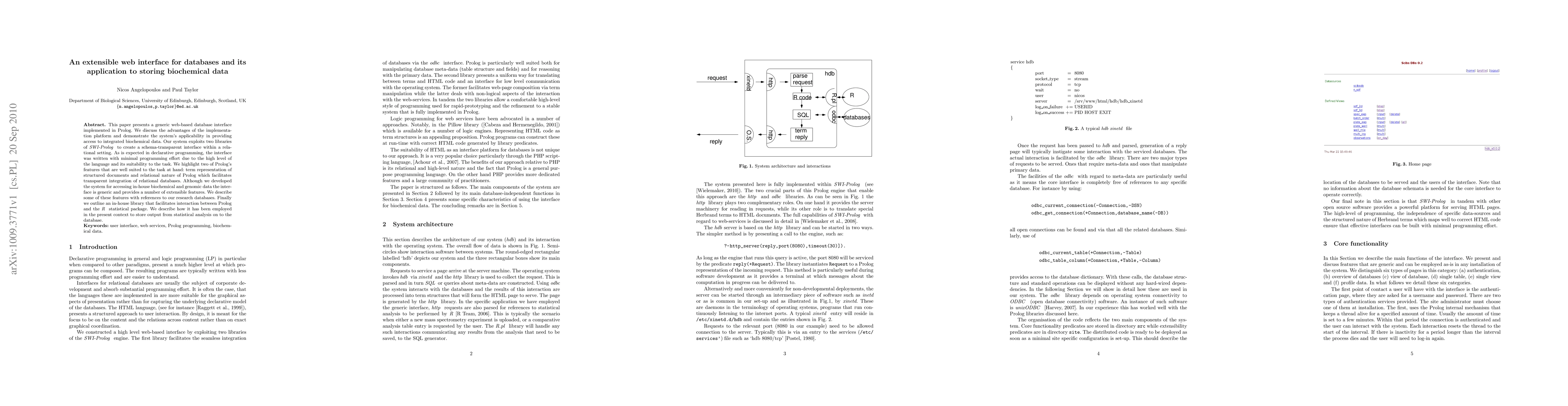 This paper presents a generic web-based database interface implemented in Prolog. We discuss the advantages of the implementation platform and demonstrate the system's applicability in providing access to integrated biochemical data. Our system exploits two libraries of SWI-Prolog to create a schema-transparent interface within a relational setting. As is expected in declarative programming, the interface was written with minimal programming effort due to the high level of the language and its suitability to the task. We highlight two of Prolog's features that are well suited to the task at hand: term representation of structured documents and relational nature of Prolog which facilitates transparent integration of relational databases. Although we developed the system for accessing in-house biochemical and genomic data the interface is generic and provides a number of extensible features. We describe some of these features with references to our research databases. Finally we outline an in-house library that facilitates interaction between Prolog and the R statistical package. We describe how it has been employed in the present context to store output from statistical analysis on to the database.