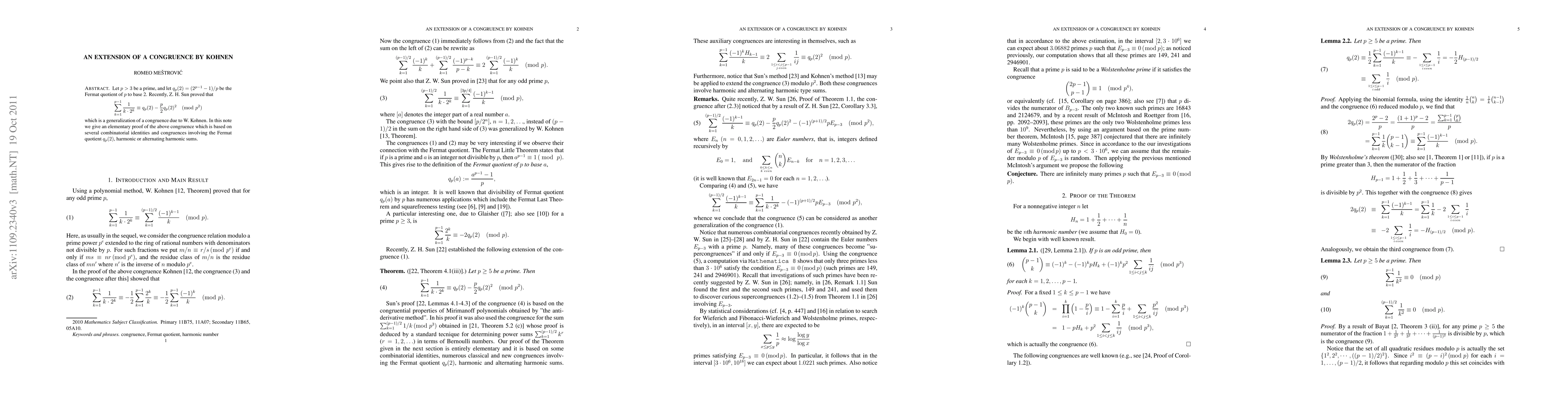 Let $p>3$ be a prime, and let $q_p(2)=(2^{p-1}-1)/p$ be the Fermat quotient of $p$ to base 2. Recently, Z. H. Sun proved that \sum_{k=1}^{p-1}\frac{1}{k\cdot 2^k}\equiv q_p(2)-\frac{p}{2}q_p(2)^2 \pmod{p^2} which is a generalization of a congruence due to W. Kohnen. In this note we give an elementary proof of the above congruence which is based on several combinatorial identities and congruences involving the Fermat quotient $q_p(2)$, harmonic or alternating harmonic sums.