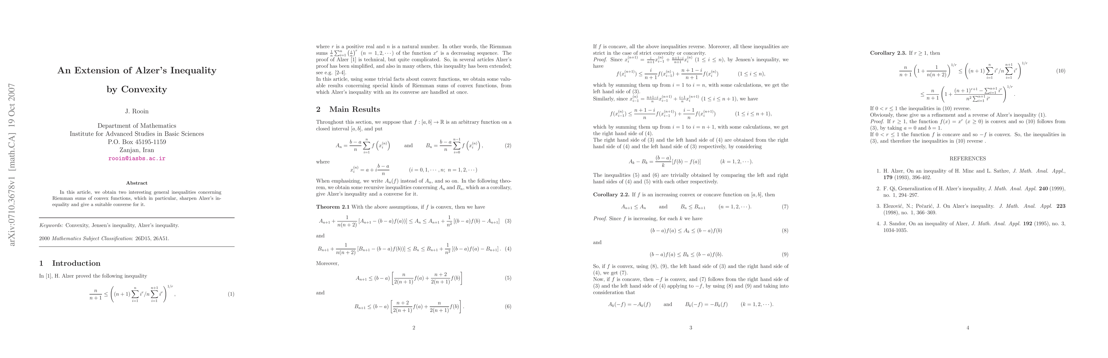 In this article, we obtain two interesting general inequalities concerning Riemman sums of convex functions, which in particular, sharpen Alzer's inequality and give a suitable converse for it.