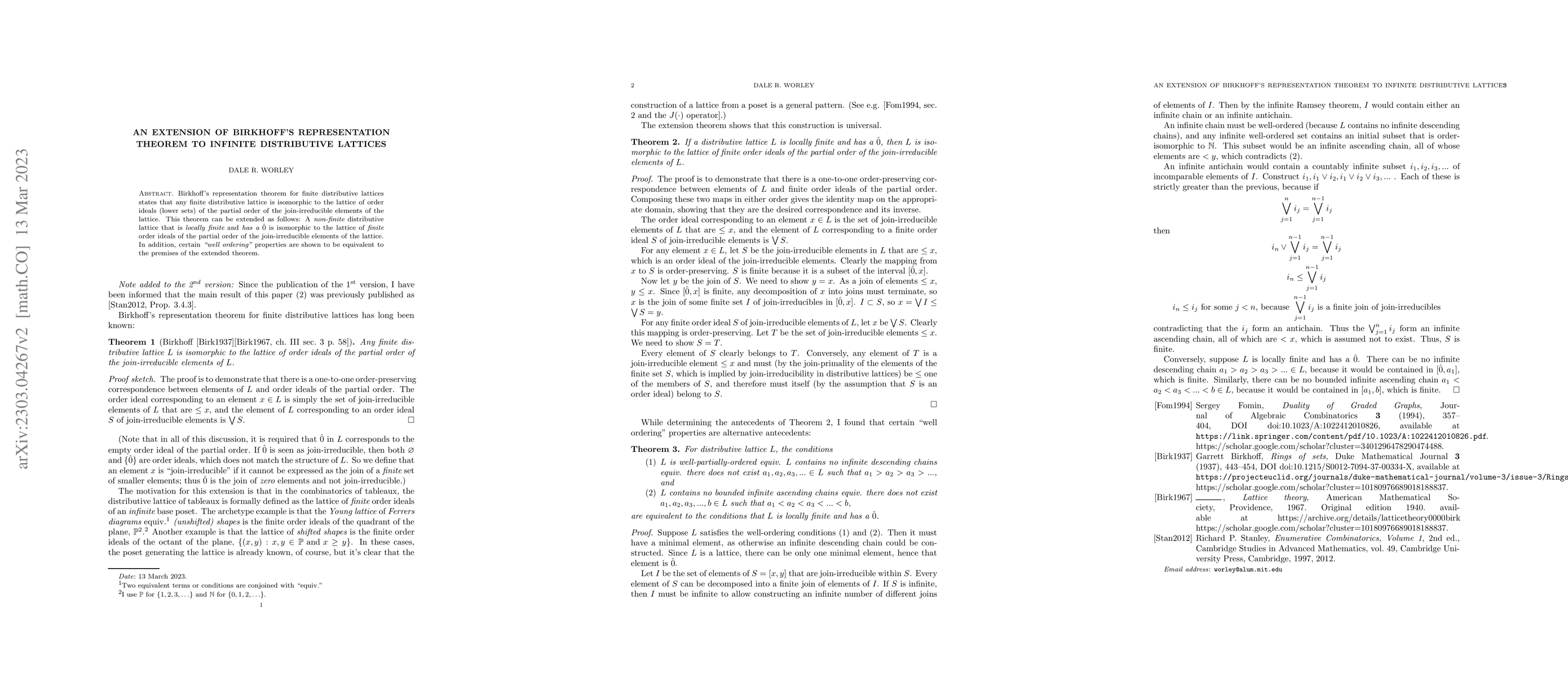 This paper extends Birkhoff's representation theorem to infinite distributive lattices, showing that locally finite lattices with a bottom element are isomorphic to the lattice of their finite order ideals. It also demonstrates that specific "well ordering" properties are equivalent to the conditions of this extended theorem.