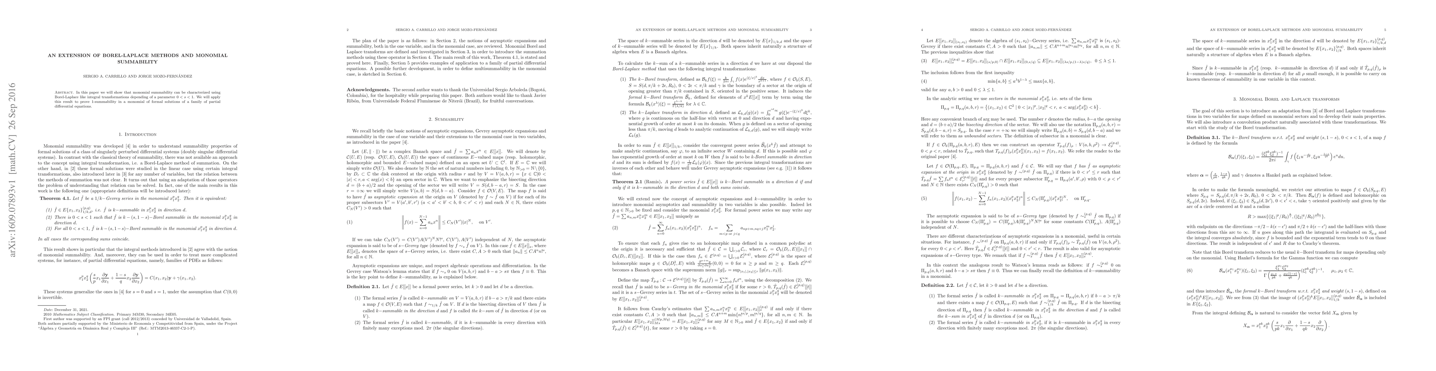 This paper extends Borel-Laplace methods to characterize monomial summability via parameter-dependent integral transformations. It applies this framework to demonstrate 1-summability in monomials of formal solutions to a class of partial differential equations.
