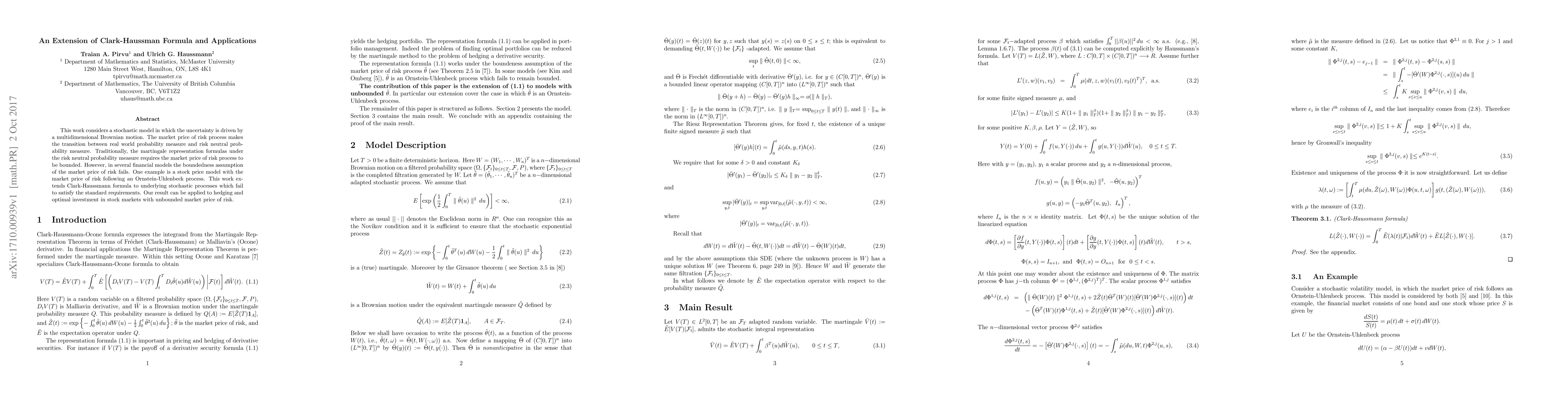 This work considers a stochastic model in which the uncertainty is driven by a multidimensional Brownian motion. The market price of risk process makes the transition between real world probability measure and risk neutral probability measure. Traditionally, the martingale representation formulas under the risk neutral probability measure requires the market price of risk process to be bounded. However, in several financial models the boundedness assumption of the market price of risk fails. One example is a stock price model with the market price of risk following an Ornstein-Uhlenbeck process. This work extends Clark-Haussmann formula to underlying stochastic processes which fail to satisfy the standard requirements. Our result can be applied to hedging and optimal investment in stock markets with unbounded market price of risk.