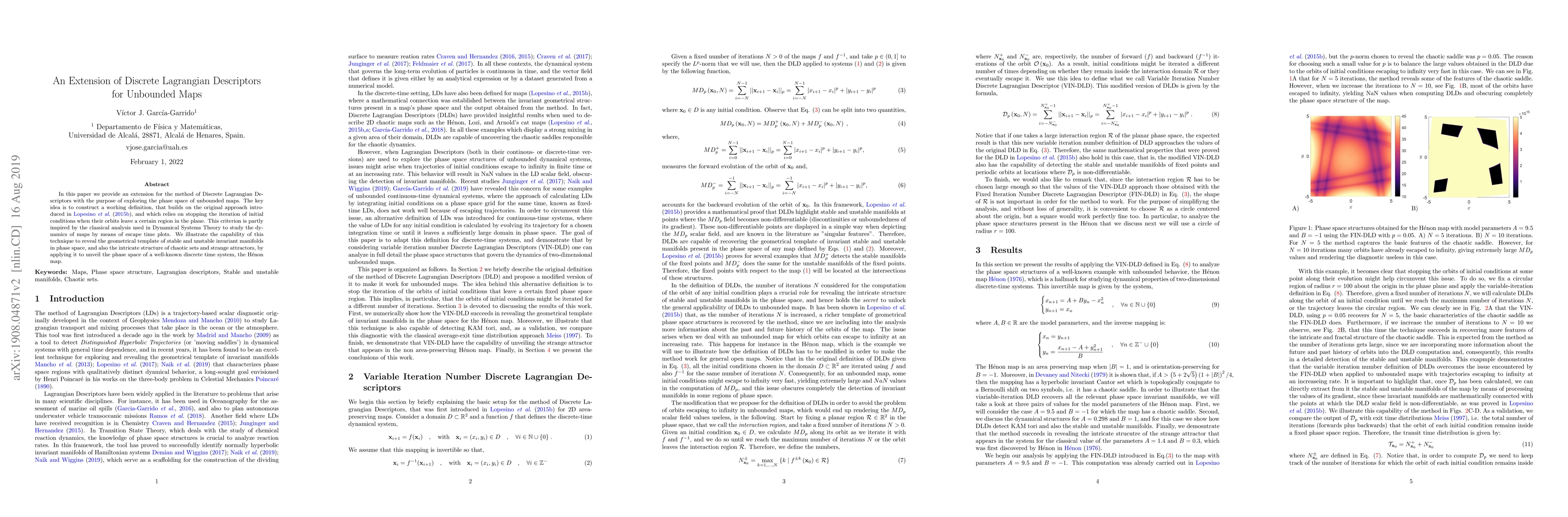 In this paper we provide an extension for the method of Discrete Lagrangian Descriptors with the purpose of exploring the phase space of unbounded maps. The key idea is to construct a working definition, that builds on the original approach introduced in Lopesino et al. (2015), and which relies on stopping the iteration of initial conditions when their orbits leave a certain region in the plane. This criterion is partly inspired by the classical analysis used in Dynamical Systems Theory to study the dynamics of maps by means of escape time plots. We illustrate the capability of this technique to reveal the geometrical template of stable and unstable invariant manifolds in phase space, and also the intricate structure of chaotic sets and strange attractors, by applying it to unveil the phase space of a well-known discrete time system, the H\'enon map.