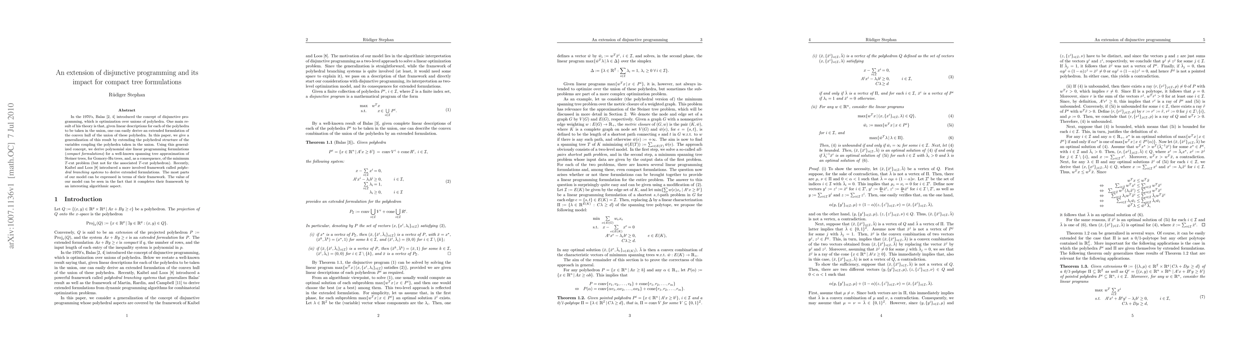 In the 1970's, Balas introduced the concept of disjunctive programming, which is optimization over unions of polyhedra. One main result of his theory is that, given linear descriptions for each of the polyhedra to be taken in the union, one can easily derive an extended formulation of the convex hull of the union of these polyhedra. In this paper, we give a generalization of this result by extending the polyhedral structure of the variables coupling the polyhedra taken in the union. Using this generalized concept, we derive polynomial size linear programming formulations (compact formulations) for a well-known spanning tree approximation of Steiner trees, for Gomory-Hu trees, and, as a consequence, of the minimum $T$-cut problem (but not for the associated $T$-cut polyhedron). Recently, Kaibel and Loos (2010) introduced a more involved framework called {\em polyhedral branching systems} to derive extended formulations. The most parts of our model can be expressed in terms of their framework. The value of our model can be seen in the fact that it completes their framework by an interesting algorithmic aspect.