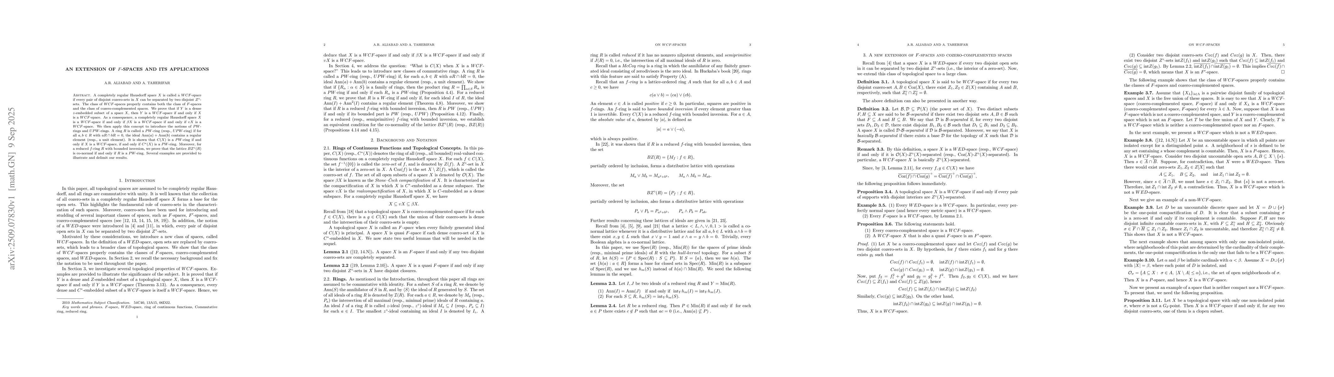 A completely regular Hausdorff space $X$ is called a $WCF$-space if every pair of disjoint cozero-sets in $X$ can be separated by two disjoint $Z^{\circ}$-sets. The class of $WCF$-spaces properly contains both the class of $F$-spaces and the class of cozero-complemented spaces. We prove that if $Y$ is a dense $z$-embedded subset of a space $X$, then $Y$ is a $WCF$-space if and only if $X$ is a $WCF$-space. As a consequence, a completely regular Hausdorff space $X$ is a $WCF$-space if and only if $\beta X$ is a $WCF$-space if and only if $\upsilon X$ is a $WCF$-space. We then apply this concept to introduce the notions of $PW$-rings and $UPW$-rings. A ring $R$ is called a $PW$-ring (resp., $UPW$-ring) if for all $a, b \in R$ with $aR \cap bR = 0$, the ideal $\Ann(a)+\Ann(b)$ contains a regular element (resp., a unit element). It is shown that $C(X)$ is a $PW$-ring if and only if $X$ is a $WCF$-space, if and only if $C^{*}(X)$ is a $PW$-ring. Moreover, for a reduced $f$-ring $R$ with bounded inversion, we prove that the lattice $BZ^{\circ}(R)$ is co-normal if and only if $R$ is a $PW$-ring. Several examples are provided to illustrate and delimit our results.
