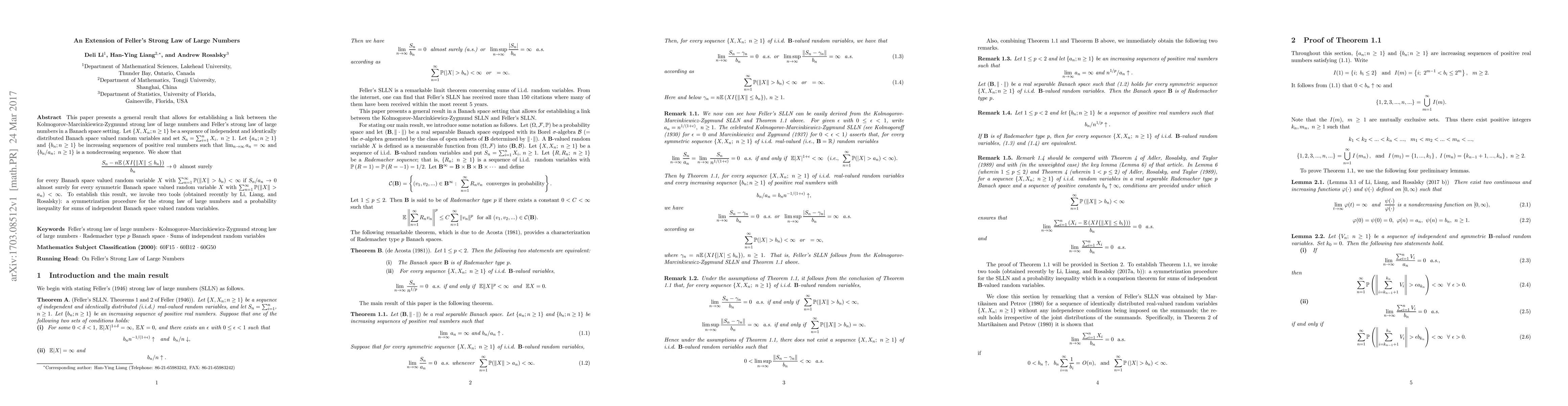 This paper extends Feller's strong law of large numbers to a Banach space setting, linking it to the Kolmogorov-Marcinkiewicz-Zygmund strong law. It demonstrates almost sure convergence of a normalized sum of i.i.d. Banach space-valued random variables under specific conditions.
