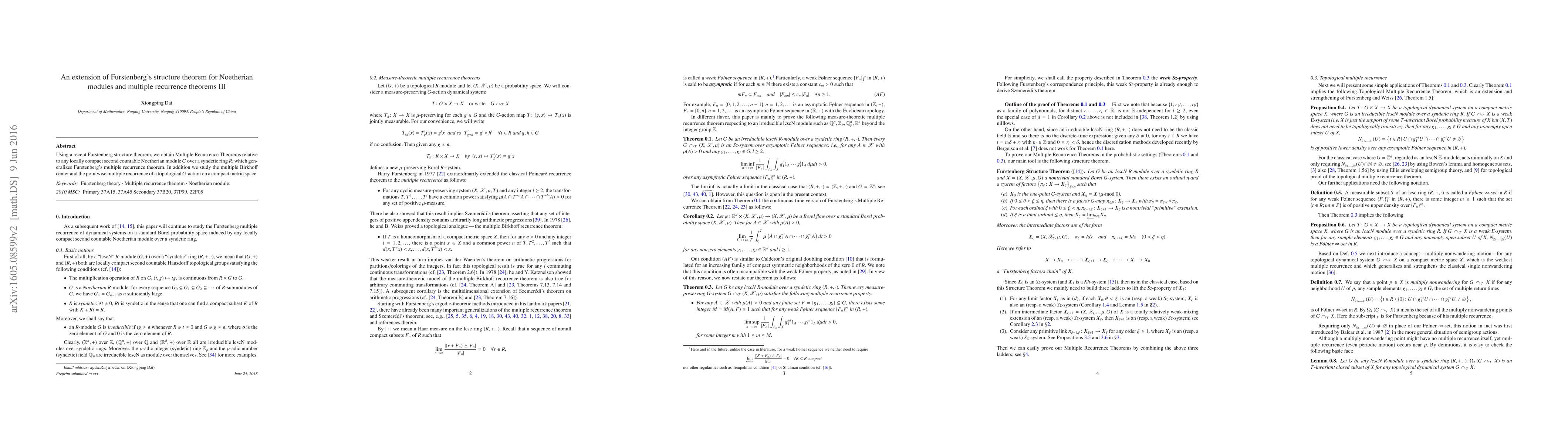 This paper extends Furstenberg's structure theorem to Noetherian modules, deriving multiple recurrence theorems for locally compact second countable Noetherian modules over syndetic rings. It also investigates the multiple Birkhoff center and pointwise multiple recurrence in topological group actions on compact metric spaces.