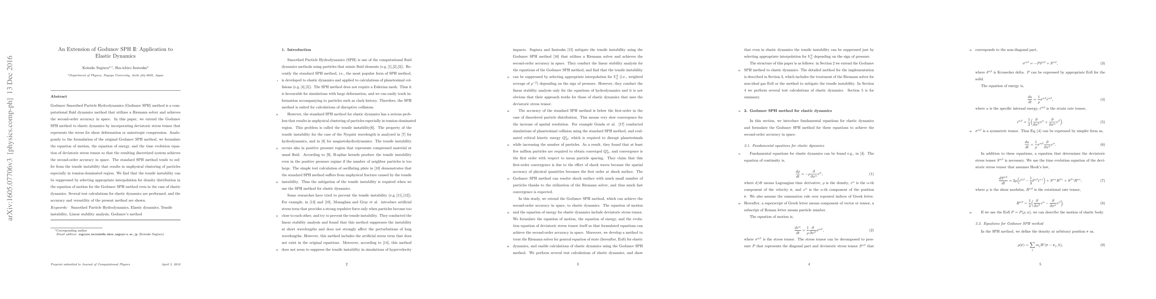 This paper extends the Godunov Smoothed Particle Hydrodynamics (SPH) method to elastic dynamics by incorporating a deviatoric stress tensor, achieving second-order accuracy in space. The method suppresses tensile instability through appropriate density interpolation, demonstrating accuracy and versatility in test calculations for elastic dynamics.
