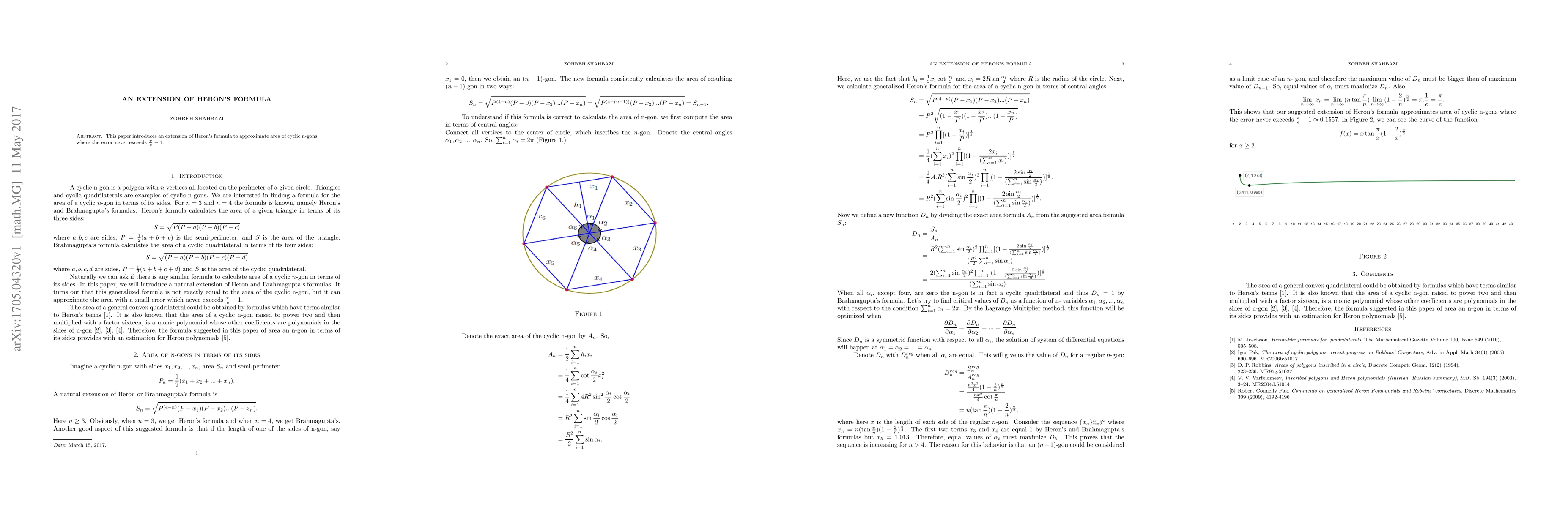 This paper introduces an extension of Heron's formula to approximate area of cyclic n-gons where the error never exceeds $\frac{\pi}{e}-1$