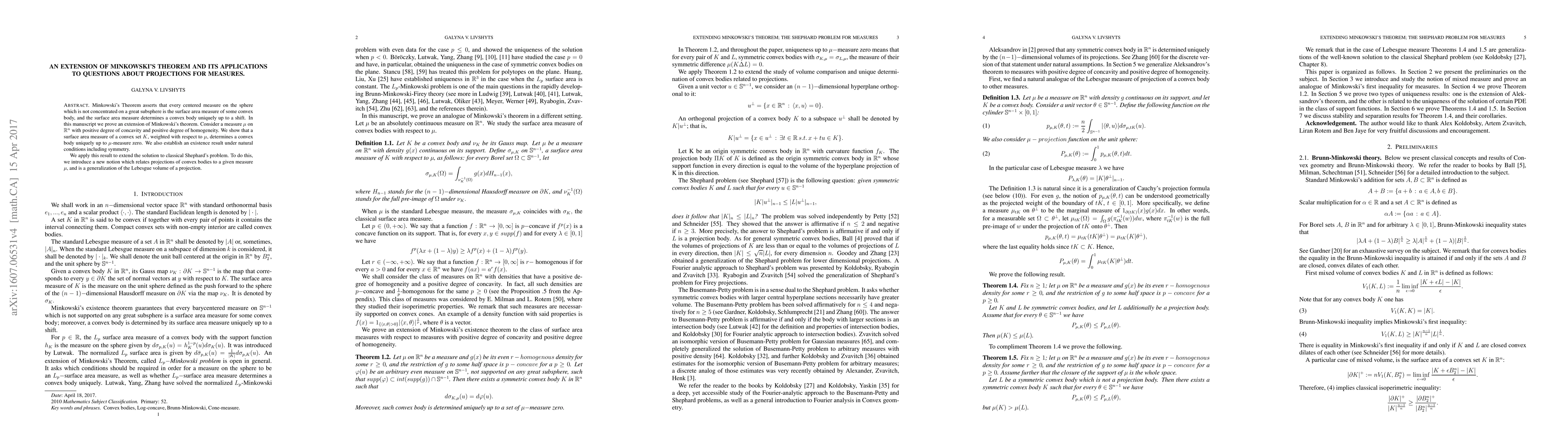 Minkowski's Theorem asserts that every centered measure on the sphere which is not concentrated on a great subsphere is the surface area measure of some convex body, and, moreover, the surface area measure determines a convex body uniquely. In this manuscript we prove an extension of Minkowski's theorem. Consider a measure $\mu$ on $\mathbb{R}^n$ with positive degree of concavity and positive degree of homogeneity. We show that a surface area measure of a convex set $K$, weighted with respect to $\mu$, determines a convex body uniquely up to $\mu$-measure zero. We also establish an existence result under natural conditions including symmetry. We apply this result to extend the solution to classical Shephard's problem, which asks the following: if one convex body in $\mathbb{R}^n$ has larger projections than another convex body in every direction, does it mean that the volume of the first convex body is also greater? The answer to this question is affirmative when $n\leq 2$ and negative when $n\geq 3.$ In this paper we introduce a new notion which relates projections of convex bodies to a given measure $\mu$, and is a direct generalization of the Lebesgue area of a projection. Using this notion we state a generalization of the Shephard problem to measures and prove that the answer is affirmative for $n\leq 2$ and negative for $n\geq 3$ for measures which have a positive degree of homogeneity and a positive degree of concavity. We also prove stability and separation results, and establish useful corollaries. Finally, we describe two types of uniqueness results which follow from the extension of Minkowski's theorem.