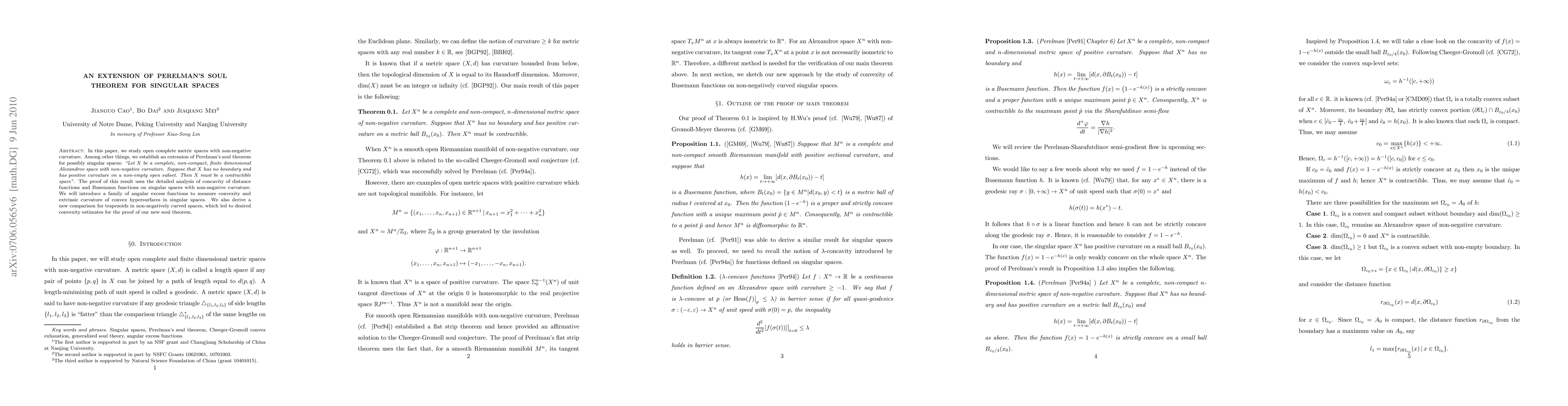 In this paper, we study open complete metric spaces with non-negative curvature. Among other things, we establish an extension of Perelman's soul theorem for possibly singular spaces: "Let X be a complete, non-compact, finite dimensional Alexandrov space with non-negative curvature. Suppose that X has no boundary and has positive curvature on a non-empty open subset. Then X must be a contractible space". The proof of this result uses the detailed analysis of concavity of distance functions and Busemann functions on singular spaces with non-negative curvature. We will introduce a family of angular excess functions to measure convexity and extrinsic curvature of convex hypersurfaces in singular spaces. We also derive a new comparison for trapezoids in non-negatively curved spaces, which led to desired convexity estimates for the proof of our new soul theorem.