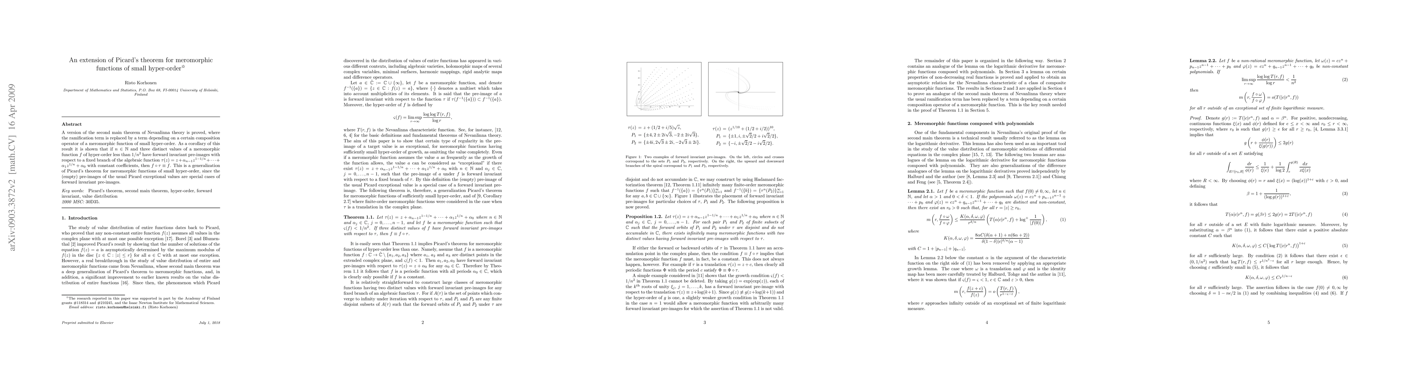 A version of the second main theorem of Nevanlinna theory is proved, where the ramification term is replaced by a term depending on a certain composition operator of a meromorphic function of small hyper-order. As a corollary of this result it is shown that if three distinct values of a meromorphic function f of hyper-order less than 1/n^2 have forward invariant pre-images with respect to a fixed branch of the algebraic function t(z)=z+a_{n-1} z^{1-1/n}+...+a_1 z^{1/n}+a_0 with constant coefficients, then f(t(z)) = f(z) for all z. This is a generalization of Picard's theorem for meromorphic functions of small hyper-order, since the (empty) pre-images of the usual Picard exceptional values are special cases of forward invariant pre-images.