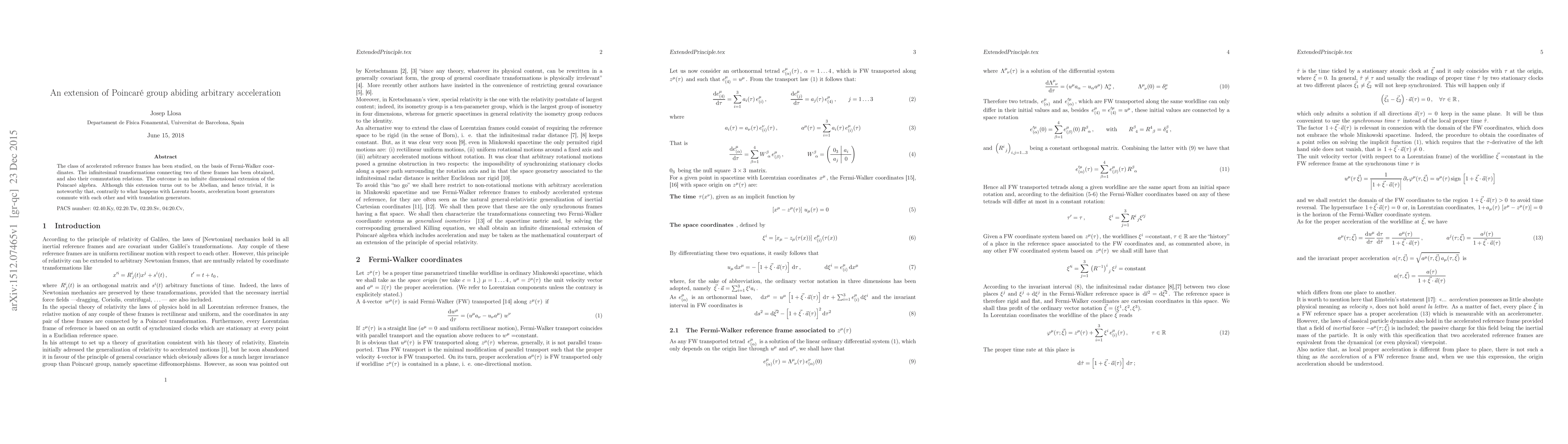 This paper extends the Poincaré group to include accelerated reference frames using Fermi-Walker coordinates, deriving an infinite-dimensional algebra. Despite the Abelian nature of this extension, it reveals that acceleration boosts commute with translations and each other, unlike Lorentz boosts.