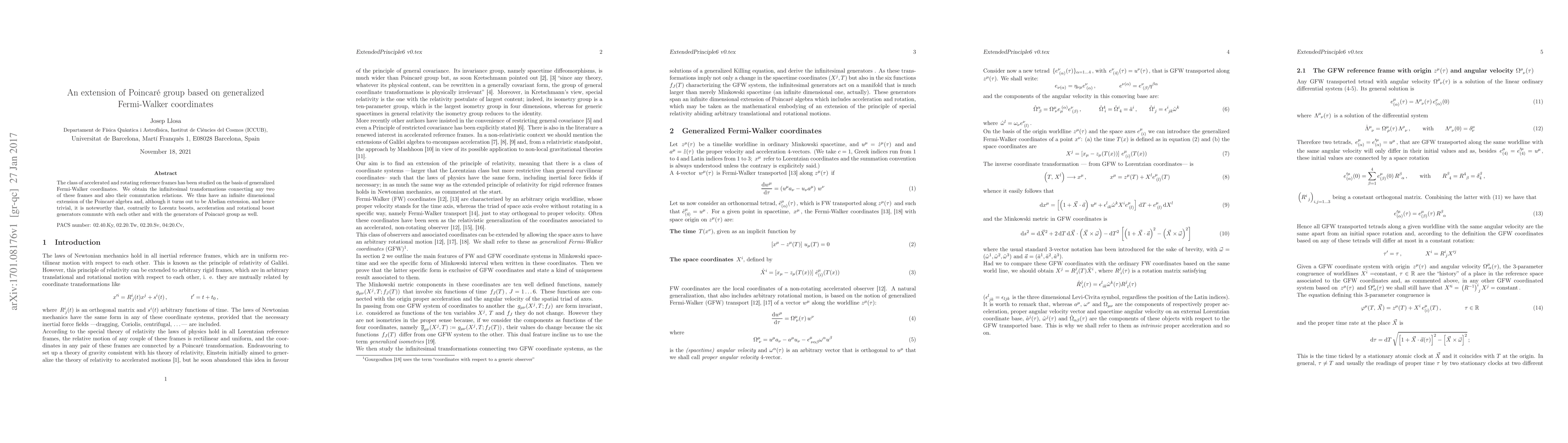 This paper extends the Poincaré group using generalized Fermi-Walker coordinates for accelerated and rotating frames, deriving the infinitesimal transformations and commutation relations. Notably, unlike Lorentz boosts, the generators for acceleration and rotational boosts commute with each other and with Poincaré group generators.