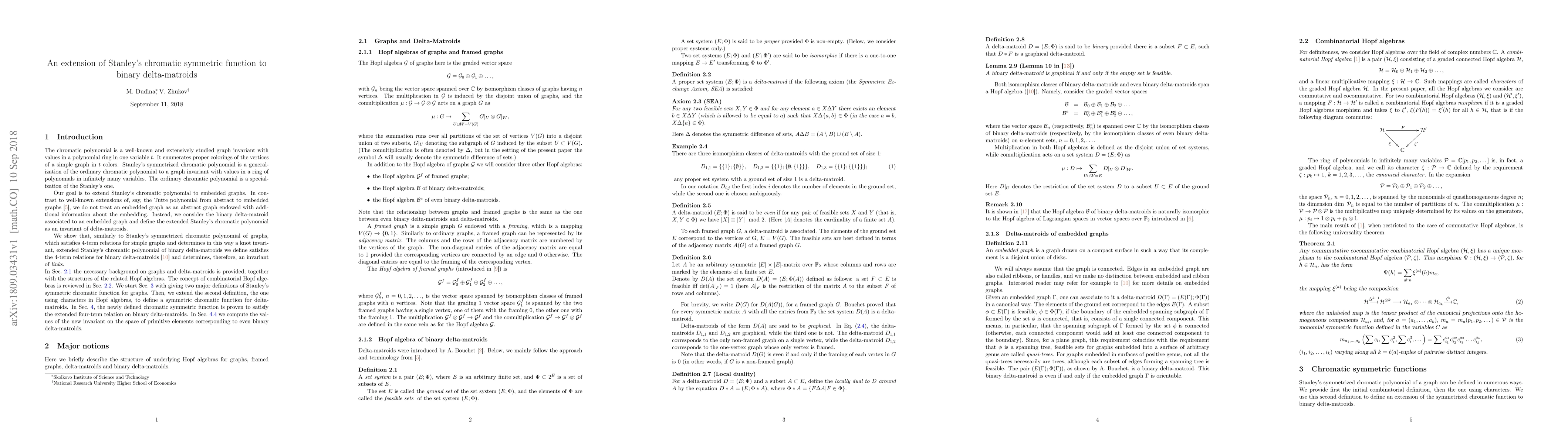 Stanley's symmetrized chromatic polynomial is a generalization of the ordinary chromatic polynomial to a graph invariant with values in a ring of polynomials in infnitely many variables. The ordinary chromatic polynomial is a specialization of the Stanley's one. Our goal is to extend Stanley's chromatic polynomial to embedded graphs. In contrast to well-known extensions of, say, the Tutte polynomial from abstract to embedded graphs [5], we do not treat an embedded graph as an abstract graph endowed with additional information about the embedding. Instead, we consider the binary delta-matroid associated to an embedded graph and define the extended Stanley's chromatic polynomial as an invariant of delta-matroids. We show that, similarly to Stanley's symmetrized chromatic polynomial of graphs, which satisfies 4-term relations for simple graphs and determines in this way a knot invariant, extended Stanley's chromatic polynomial of binary delta-matroids we define satisfies the 4-term relations for binary delta-matroids [10] and determines, therefore, an invariant of links.