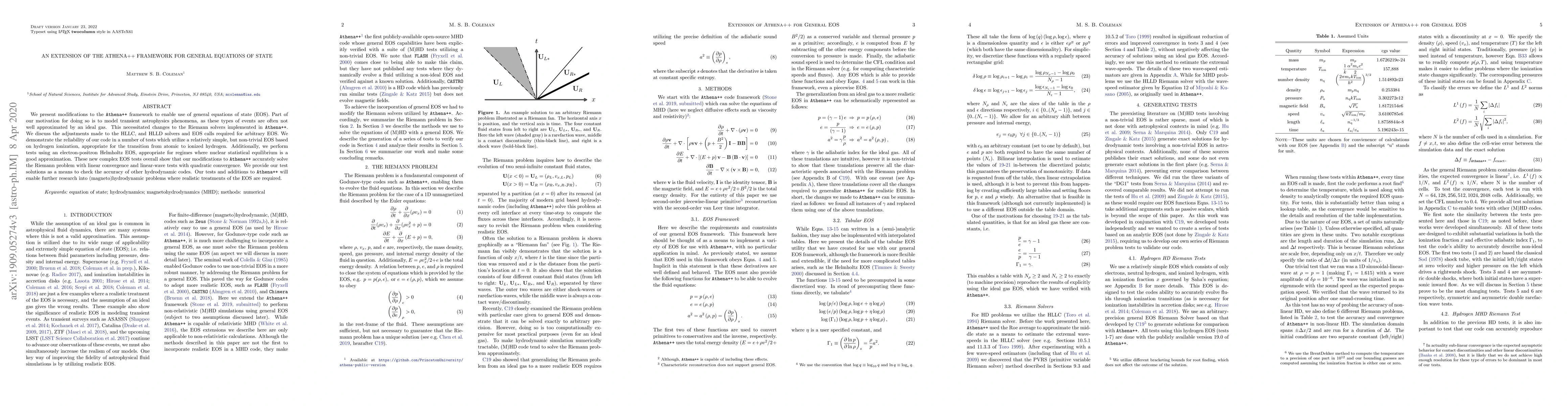 This paper extends the Athena++ framework to incorporate general equations of state (EOS), enabling more accurate modeling of transient astrophysical phenomena. The modifications include updates to Riemann solvers and EOS calls, demonstrated through tests using hydrogen ionization and electron-positron Helmholtz EOS, showing reliable and accurate results.
