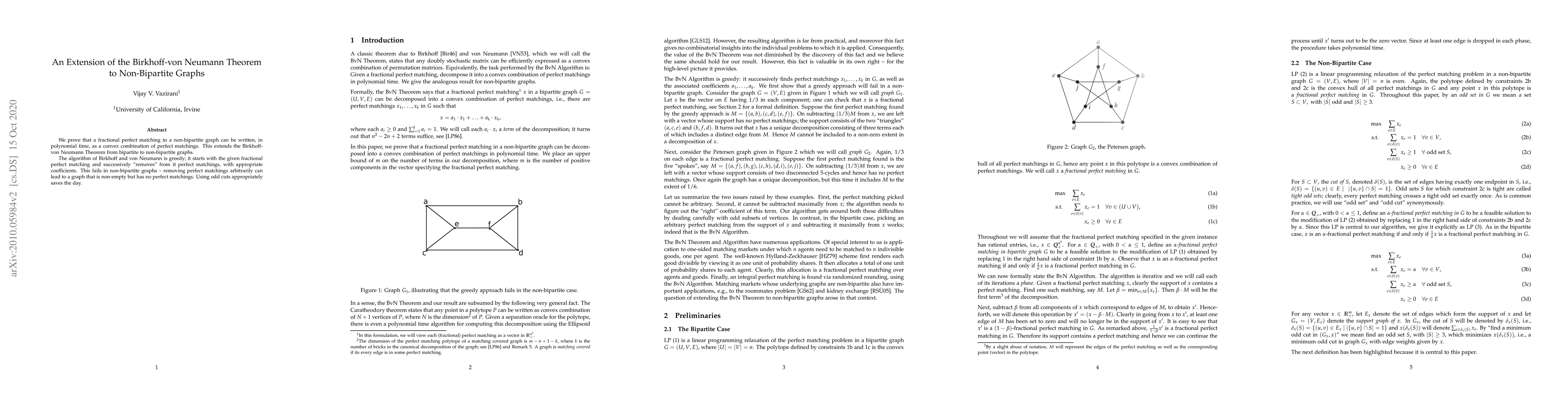 This paper extends the Birkhoff-von Neumann Theorem to non-bipartite graphs, showing that any fractional perfect matching can be represented as a polynomial-time convex combination of perfect matchings. The algorithm uses odd cuts to avoid issues that arise when removing perfect matchings in non-bipartite graphs.