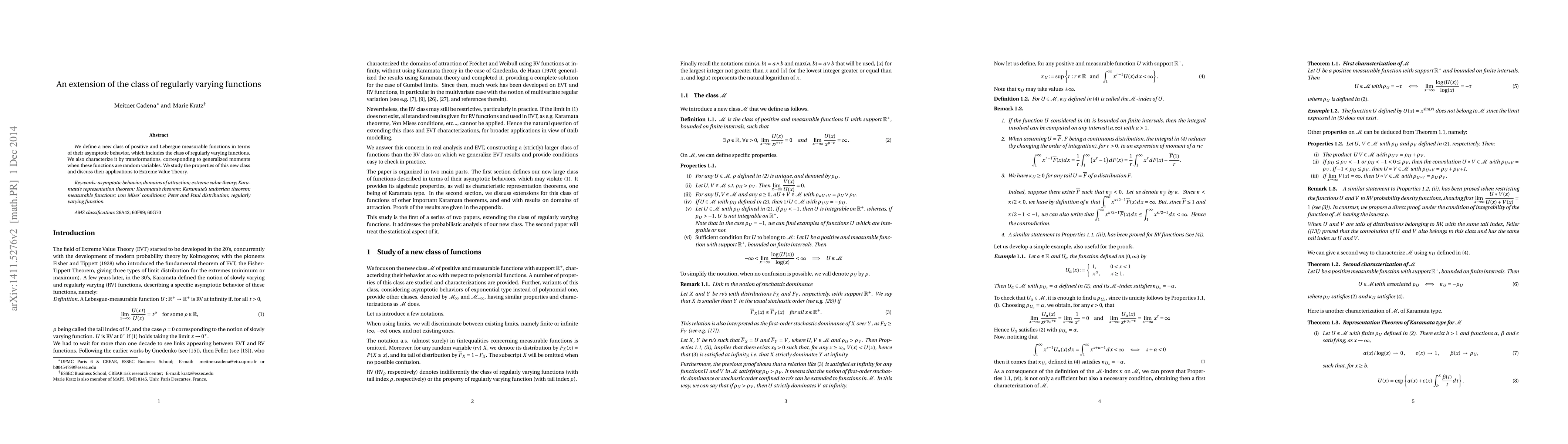We define a new class of positive and Lebesgue measurable functions in terms of their asymptotic behavior, which includes the class of regularly varying functions. We also characterize it by transformations, corresponding to generalized moments when these functions are random variables. We study the properties of this new class and discuss their applications to Extreme Value Theory.