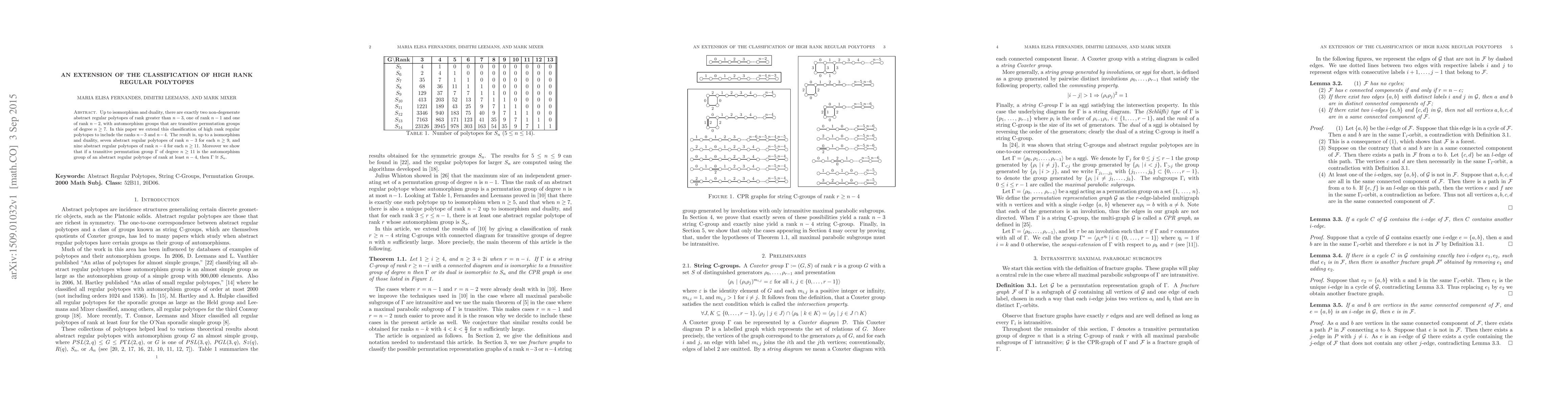 The paper extends the classification of high rank regular polytopes to include ranks $n-3$ and $n-4$, discovering 7 new polytopes of each rank for certain values of n, and proving that their automorphism groups are isomorphic to the symmetric group.