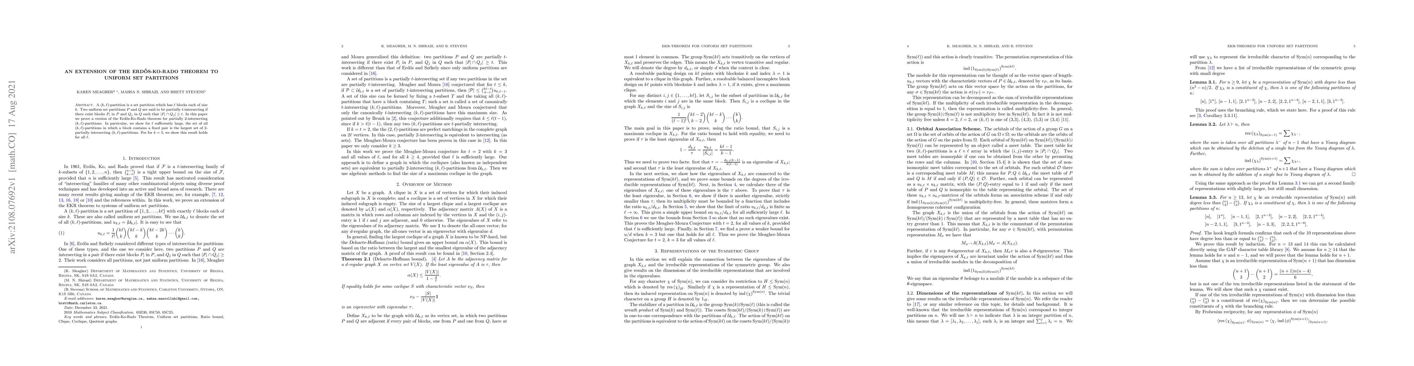 A $(k,\ell)$-partition is a set partition which has $\ell$ blocks each of size $k$. Two uniform set partitions $P$ and $Q$ are said to be partially $t$-intersecting if there exist blocks $P_{i}$ in $P$ and $Q_{j}$ in $Q$ such that $\left| P_{i} \cap Q_{j} \right|\geq t$. In this paper we prove a version of the Erd\H{o}s-Ko-Rado theorem for partially $2$-intersecting $(k,\ell)$-partitions. In particular, we show for $\ell$ sufficiently large, the set of all $(k,\ell)$-partitions in which a block contains a fixed pair is the largest set of 2-partially intersecting $(k,\ell)$-partitions. For for $k=3$, we show this result holds for all $\ell$.
