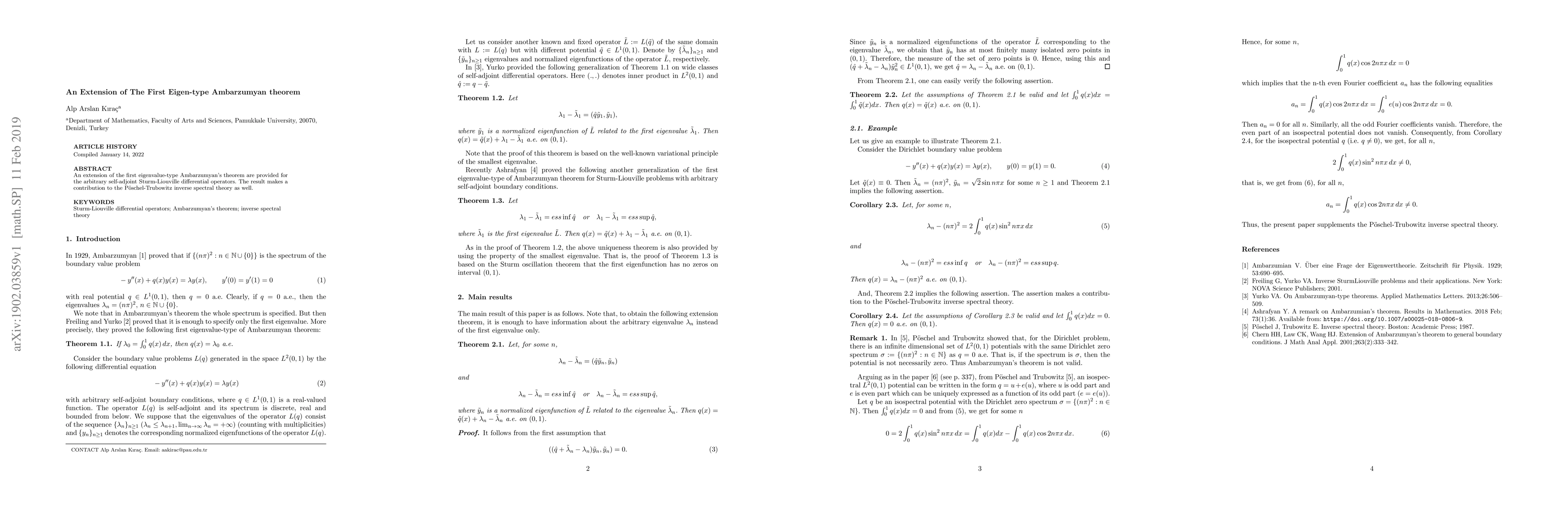 This paper extends Ambarzumyan's first eigenvalue-type theorem to arbitrary self-adjoint Sturm-Liouville differential operators, contributing to the P\"oschel-Trubowitz inverse spectral theory. The findings advance the understanding of spectral properties in mathematical physics.