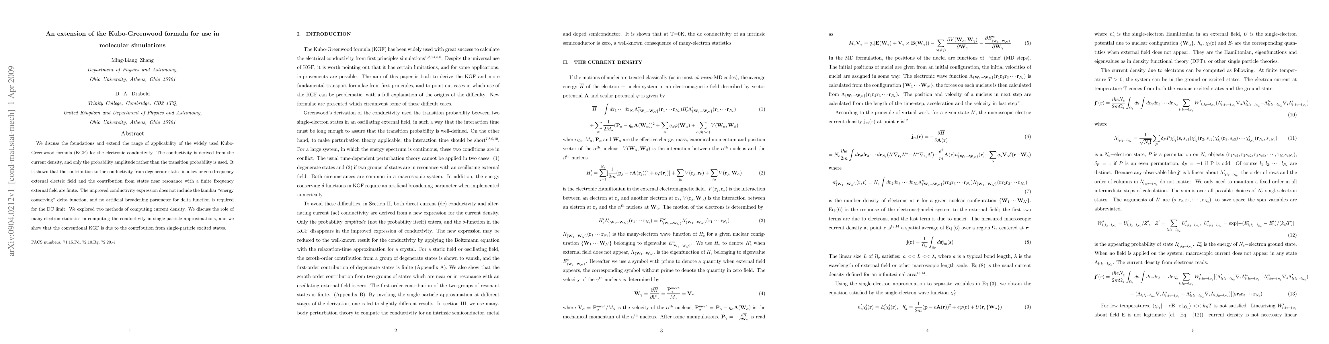 This paper extends the Kubo-Greenwood formula for electronic conductivity, eliminating the need for artificial broadening parameters. It introduces a method using probability amplitudes instead of transition probabilities, applicable to degenerate states in low/zero frequency fields and near resonance states in finite frequency fields. The improved formula doesn't require the 'energy conserving' delta function for DC limit, and explores two current density computation methods. It also discusses many-electron statistics' role in single-particle approximation conductivity calculations.