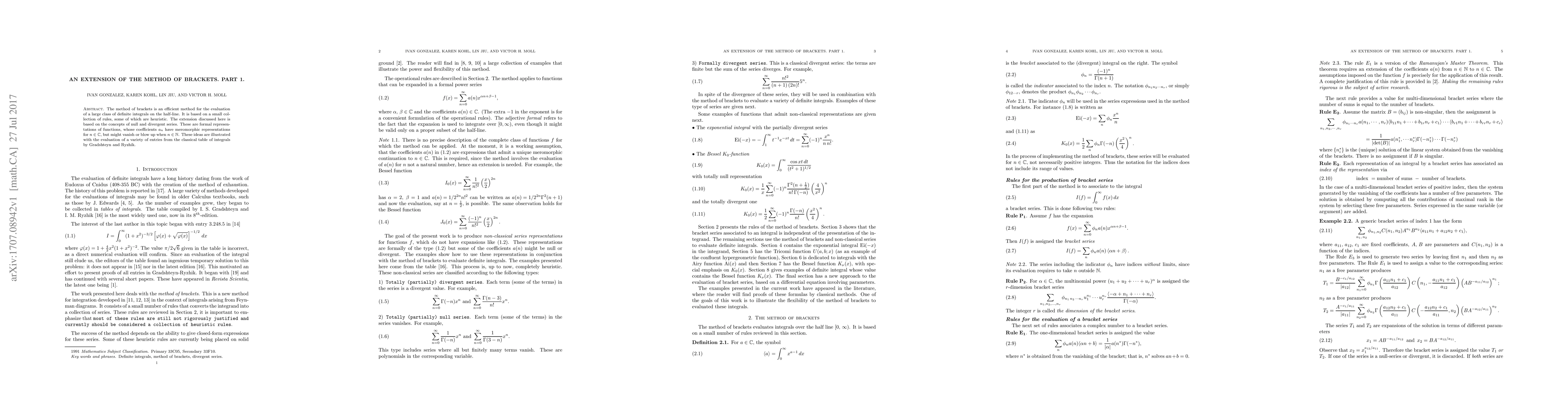 The method of brackets is an efficient method for the evaluation of a large class of definite integrals on the half-line. It is based on a small collection of rules, some of which are heuristic. The extension discussed here is based on the concepts of null and divergent series. These are formal representations of functions, whose coefficients $a_{n}$ have meromorphic representations for $n \in \mathbb{C}$, but might vanish or blow up when $n \in \mathbb{N}$. These ideas are illustrated with the evaluation of a variety of entries from the classical table of integrals by Gradshteyn and Ryzhik.
