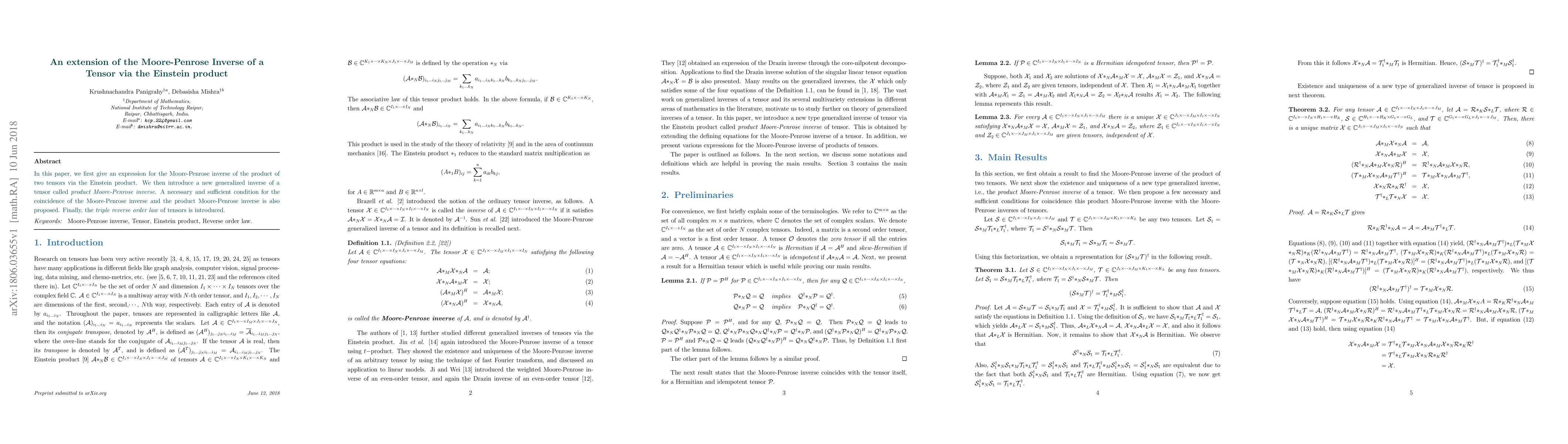 This paper extends the Moore-Penrose inverse to tensor products using the Einstein product, introduces a new product Moore-Penrose inverse, and proposes a condition for their equivalence, alongside presenting the triple reverse order law for tensors.