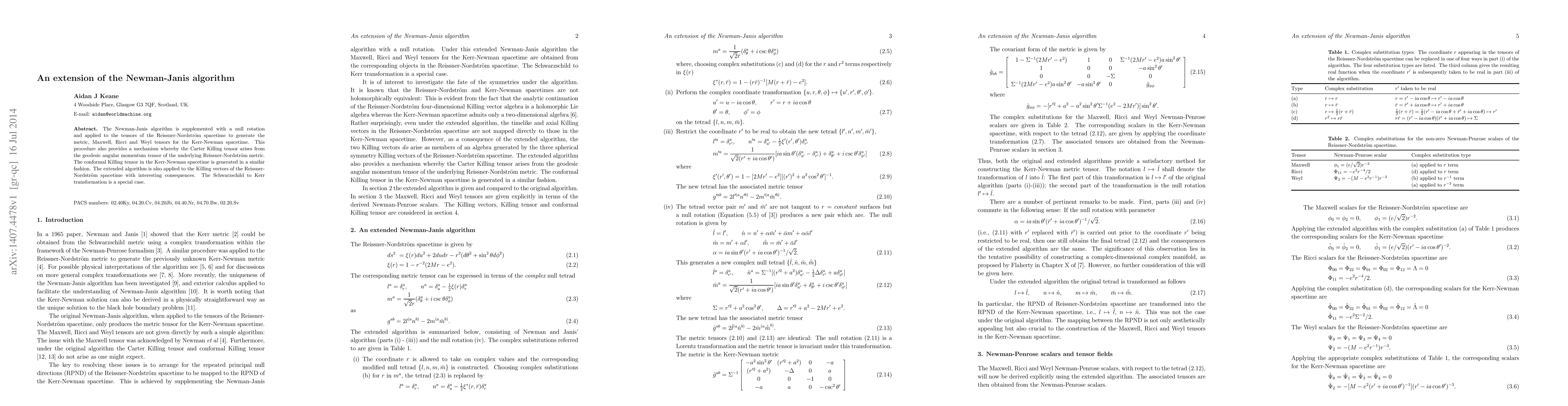 The Newman-Janis algorithm is supplemented with a null rotation and applied to the tensors of the Reissner-Nordstr\"om spacetime to generate the metric, Maxwell, Ricci and Weyl tensors for the Kerr-Newman spacetime. This procedure also provides a mechanism whereby the Carter Killing tensor arises from the geodesic angular momentum tensor of the underlying Reissner-Nordstr\"om metric. The conformal Killing tensor in the Kerr-Newman spacetime is generated in a similar fashion. The extended algorithm is also applied to the Killing vectors of the Reissner-Nordstr\"om spacetime with interesting consequences. The Schwarzschild to Kerr transformation is a special case.