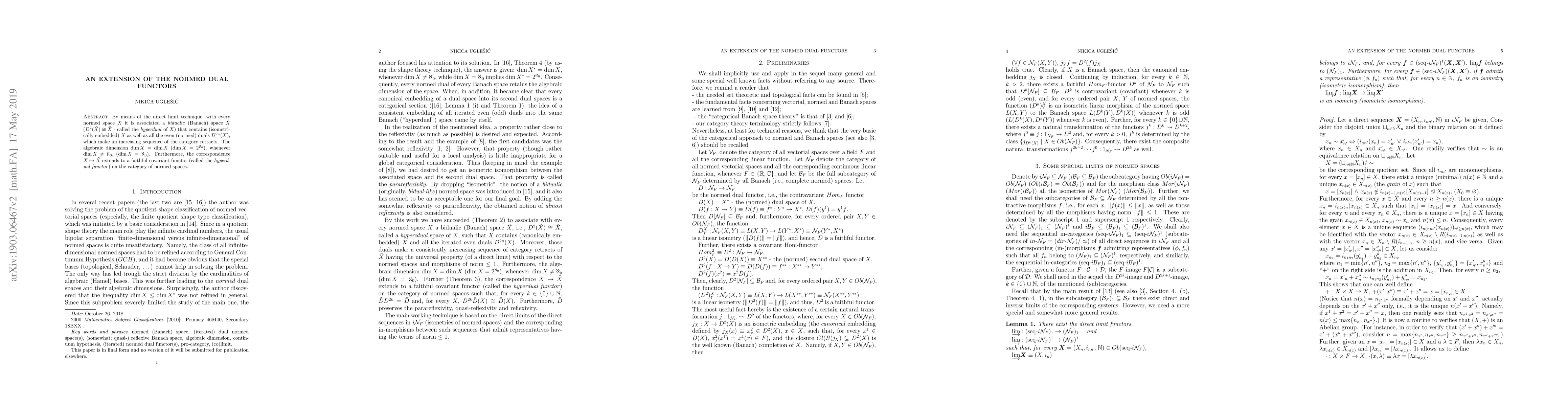 By means of the direct limit technique, with every normed space X it is associated a bidualic (Banach) space $\tilde{X} (D^2( \tilde{X}) \cong \tilde{X} $ - called the hyperdual of $X$) that contains (isometrically embedded) $X$ as well as all the even (normed) duals $D^{2n}(X)$, which make an increasing sequence of the category retracts. The algebraic dimension dim $\tilde{X}$ = dim $X$ (dim $\tilde{X}$ = $2^{\aleph_0}$ ), whenever dim $X \neq \aleph_0$, (dim $X = \aleph_0$). Furthermore, the correspondence $X \mapsto \tilde{X}$ extends to a faithful covariant functor (called the hyperdual functor) on the category of normed spaces.